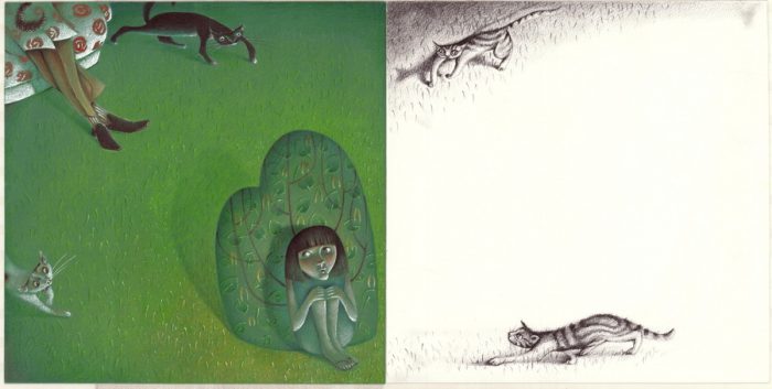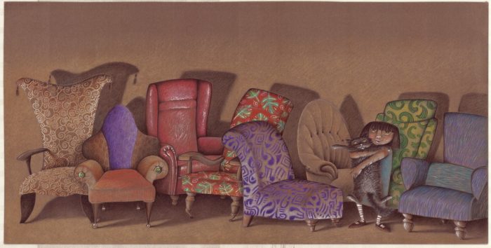 Već u prvoj slikovnici Kjel – crna labud ptica upoznajemo se sa specifičnim likovnim rukopisom autora izraženim prvenstveno kroz prikaz labudova s ornamentalnim vitičastim uzorkom koji se ponavlja i kod oblikovanja planina u daljini. Gospodin Otto i stari naslonjači osebujna je problemska slikovnica čija upečatljiva naslovnica privlači pažnju dubokom zelenom bojom naslonjača koji isijava svjetlost dok veliki broj mačaka u čudu gleda što se događa. Spiralne vitice slične uzorku na Kjelu postaju zaštitni znak naslonjača različitih boja, oblika i uzoraka, dok ritam definira izmjena ilustracije u boji koja se na nasuprotnoj stranici nastavlja u akromatskom prikazu. Nije me strah slikovnica je u kojoj autor emociju glavnog protagonista utjelovljuje kroz dočaravanje sablasne okoline zastrašujućih stabala i prijetećih krošnji te kroz krupni prikaz lica prestrašenog dječaka. Strah zamjenjuje tuga u idućoj slikovnici Djevojčica i ptica. Prazan crni prostor direktni je izraz samoće, dok su djevojčica i ptica često prikazani predimenzionirani, a fokus je na njihovoj toploj interakciji. Kako se priča razvija dolazi do značajne promjene tonaliteta od dubokog crnila do bogate rapsodije boja.