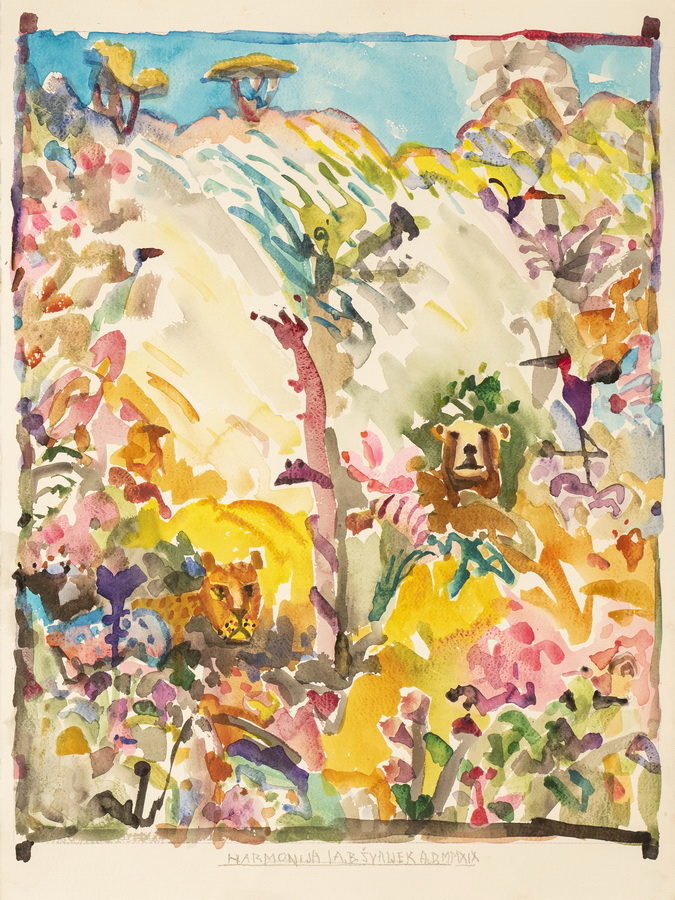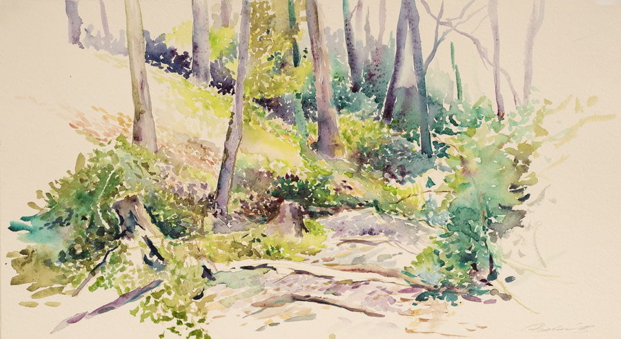 Bogatstvo interpretacije klasičnog motiva pejzaža spoznajemo u međusobno posve različitim likovnim pristupima istoj temi u radovima Marte Tuta, Branke Radonić i Nikoline Knežević. Panoramski pogled na planinsku šumu u radu “Put kroz divljinu”, poetičan fragment apstrahiran iz šetnje šumom u djelu “Meditacija u šumi” i stiliziran, krajnje prozračan, prikaz vodenog ljiljana u radu “Lotus Lily” povezuje stvaralačka svježina, bogatstvo boje, te osjećaj autorica za uravnotežen odnos koloriranih elemenata i bjeline podloge koja ima jednakovrijednu ulogu u gradnji kompozicije slike. S druge strane, mogućnost raspona akvarelne tehnike možda ponajbolje uviđamo usporedbom džungle Antuna Borisa Švaljeka i grada Damira Facana-Grdiše. Radost i sreća života utjelovljene su u eksploziji boja slobodno razlivene transparentne mrlje, gdje šarenilo, vedrina i svjetlost definiraju karakter slike “Harmonija” autora Antuna Borisa Švaljeka pri čemu iz popratne kulise prirodne divljine izviru životinje poput medvjeda, geparda, zmije i ptica. Koncentracija, strpljivost i struktura zamjenjuju životnu džunglu u radu Damira Facana-Grdiše koji preciznim nizanjem tonova iste boje gradi urbane vizure. Maksimalno “ukroćen” karakter akvarela pokazuje svoju posve drugačiju stranu u djelu “Grad uspravni” gdje do izražaja dolazi karakter tankoćutne britkosti crteža s kojim je akvarelna boja već ranije kroz povijest usko surađivala. No, unatoč kontroli boje u oblikovanju rastera ponavljajućih elemenata svježina, sjaj i svjetlost akvarela zadržavaju primat definiranja atmosfere pojedinog rada.