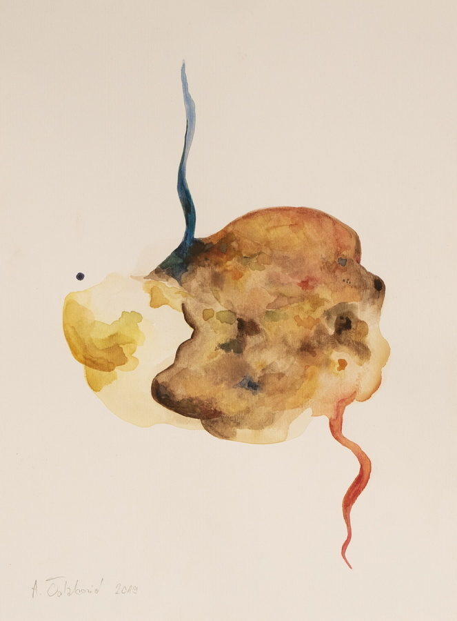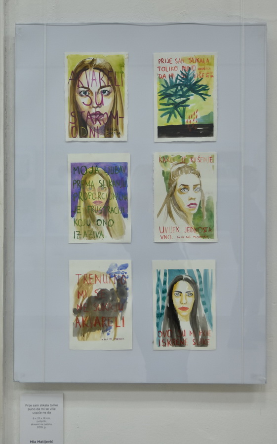 Među djelima iznimne poetike koja su u srži uhvatila duh akvarela svakako valja spomenuti rad Sanje Pribić. “Portret N.” djelo je u kojem autorica postavlja crtačko naspram slikarskog. Lice s jedne strane gradi linija očnog kapka, nosa i usta, dok druga strana lica ponavlja iste elemente, ali na vodenoj podlozi pri čemu se linija rastače i gradi volumen usana i nosa, te dubinu oka mijenjajući cijelu psihologiju lica. Tankoćutno, lirično, minimalističko, a opet toliko sugestivno, snažno i dojmljivo djelo u potpunosti zadržava dignitet tehnike te iskazuje autoričino iskonsko osjećanje samog akvarela. Na posve drugačiji način rad mlade akademske umjetnice Ane Čolaković utjelovljuje promjenjiv karakter akvarela na površini papira. Fluentna organska forma svojim unutarnjim kretanjem, simbolikom i asocijativnim nazivom “Klica” otvara mogućnost višestrukih interpretacija. Transparentna slojevitost mrlja u mrlji predstavlja nukleus ideje. Masa organskog obličja u zemljanim tonovima uravnotežena je plavom i crvenom linijom nasuprotnih kretanja i značenja. Rad korespondira s bjelinom papira, dok mala kružna mrlja izvan nukleusa zaokružuje cijelu misao te daje točku na “i” formi dovršenog i sadržajno cjelovitog rada u duhu lirske apstrakcije.