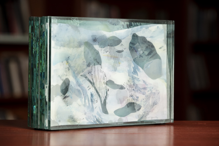 Izlazak u trodimenzionalni prostor pratimo kroz dva rada koja kombiniraju staklo i akvarel. Nikolina Šimunović izlaže stakleni objekt “U đardinu” sazdan od niza staklenih ploča između kojih je smješten akvarel na papiru i mrežici. Svaki sloj akvarela interpretira određeni segment prirode, a objedinjavanjem slojeva stvoren je jedinstveni đardin s mnoštvom detalja koji se preklapaju, nadopunjuju, naziru i nestaju ovisno o kutu gledanja. Anton Vrlić kao dugogodišnji sudionik triennala akvarela uvijek iznova propituje mogućnosti tehnike te, kao i u svom stalnom umjetničkom radu, zalazi u polje eksperimenta u predstavljenom objektu “Alkemija akvarela i stakla”. Umjetnik akvarelnom bojom slika imaginarni pejzaž na papiru koji potom kida na dijelove i stavlja u staklenku koju puni vodom. U takvom okruženju boja se otpušta s papira i postaje dio vodene mase. Na taj način vodena boja opstaje u vječno nedefiniranom prostoru supostojeći s papirom s kojeg se otisnula. Transparentna staklenka omogućuje nam da pratimo gibanje vode i boje koja se izmjenjuje s dijelovima papira. Akcenti – mrlje boje i bjelina papira – identični su kao i u klasičnom akvarelu na papiru samo su sada pretočeni u trodimenzionalni svijet zarobljen unutar staklenog objekta.