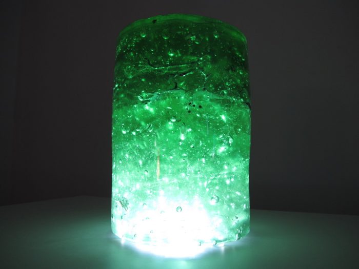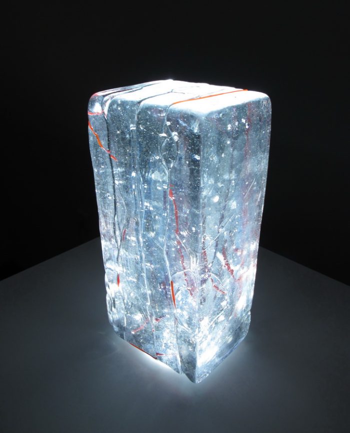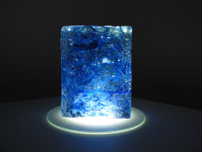 Tema čovjekovog djelovanja na prirodu nastavlja se u staklenim skulpturama nastalim paralelno s enformelističkim platnima. Staklo kao esencijalni gradivni element materičnih slika pretače se u staklene skulpture koje mrlju, liniju i boju zarobljavaju unutar staklene opne. Površina i nutrina staklenih kubusa postaje reciklažno dvorište. Korelacija između slika i skulptura vidljiva je u komplementarnom odnosu boja i korištenih materijala. Akromatsko platno s naglaskom armaturne žice na crnoj podlozi pronašlo je svoju inačicu u prozirnom valjku s armaturnim elementom. Zeleno platno akcentirano komadićima stakla formiranim u vodoravne nizove prenešeno je u bogatstvo tamnozelenog valjka. Nepravilni organski oblici Staklarija čine okvir niza supstanci koncentriranih unutar staklenih formi. Kao da je sav život uhvaćen unutar staklenog bloka. Mjehurići zraka, štapići, žice i razni koloristički akcenti naznačuju sadržaj, te intrigiraju i privlače pažnju promatrača. U platnima koncentriran na višegodišnji proces taloženja, Vrlić u staklenim skulpturama, svjestan brzine prolaska odlučujućeg trenutka, namjerno ne kontrolira i ne korigira nastale slučajnosti unutar rada, ističući tako i nemogućnost naknadne izmjene ljudskog djelovanja u prirodi.