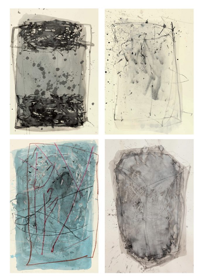 Ciklus crteža i staklenih skulptura Antona Vrlića uvodi nas u svijet promišljanja i propitivanja vlastite nutrine. Namjere i ideje bivaju pretočene na papir natopljen vodom pri čemu crtež teče imitirajući staklenu masu pri lijevanju. Fluidnost mrlje tuša obogaćena je uplivima urezivanja, grebanja i nabadanja različitim predmetima.