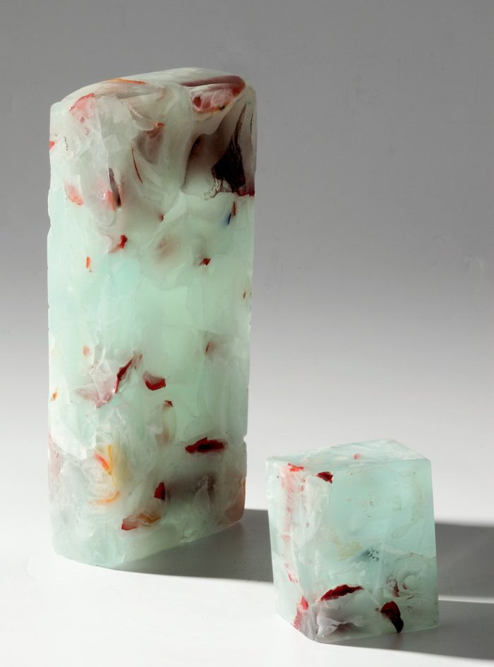 Treperenje crtačkih elemenata materijalizirano je kroz spontanost i slobodu sadržaja koji u samom procesu nastajanja staklenih skulptura poprima svoju završnu, često nepredvidljivu formu. Tako se primjerice stakleni štapići u boji, na crtežima naznačeni pastelom, pod pritiskom širenja staklene mase slobodno formiraju u središtu materije ili povremeno ostaju zalijepljeni uz stjenku kalupa.