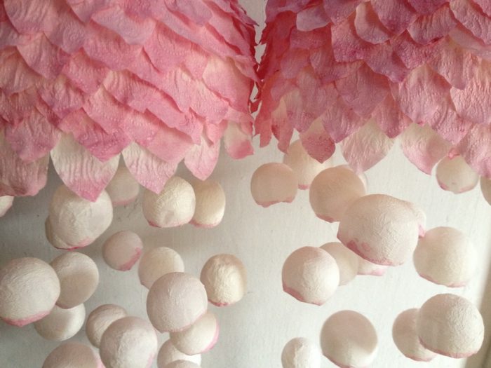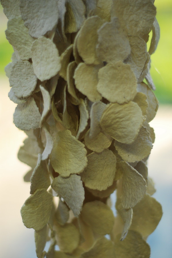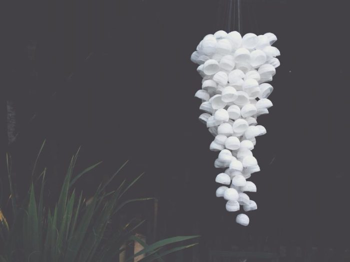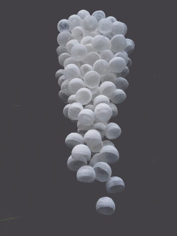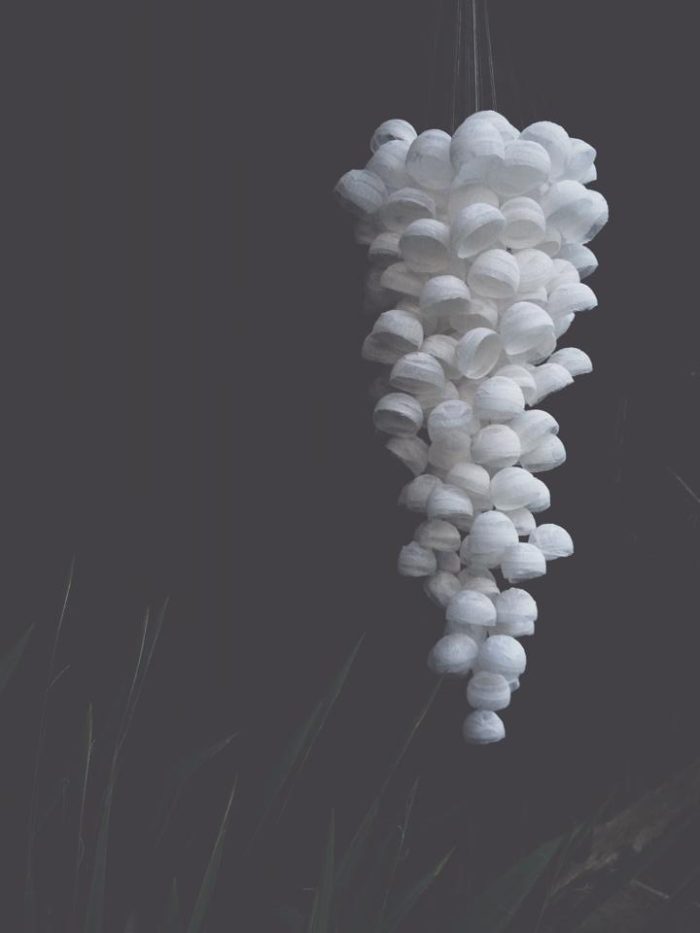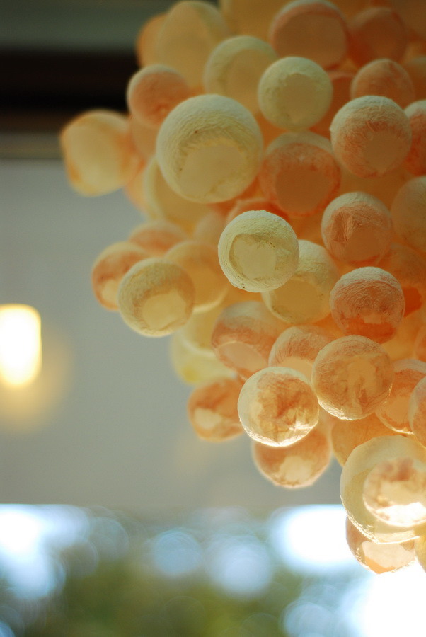 Na tankim nitima grozdovi jedinstvenih oblika u nježnim tonovima breskve svojim nepravilnostima pridonose dojmu organičkog spleta formi. Izmjena slobodno raspoređenih većih i manjih čaški pojačava dinamičnost viseće strukture grožđa.