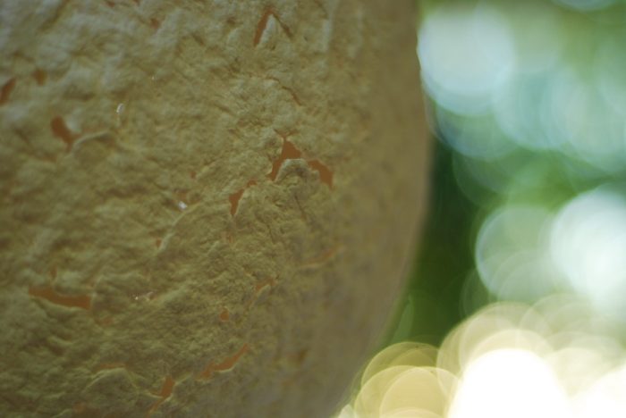 Igra s pulpom nastavlja se i u radu Rigo gdje se ključna transformacija odvija na planu oblika – klobuk biva zamijenjen ovalom koji bojom, teksturom i oblikom podsjeća na ljusku jajeta. Kroz otvor u podnožju opne visi snop usitnjenih dijelova pulpe. Delikatnost korištenog materijala naznačena je sitnim rascjepima u opni ljuske. Cijela forma akcentira krhkost i delikatnost nastanka, ali i opstanka života.