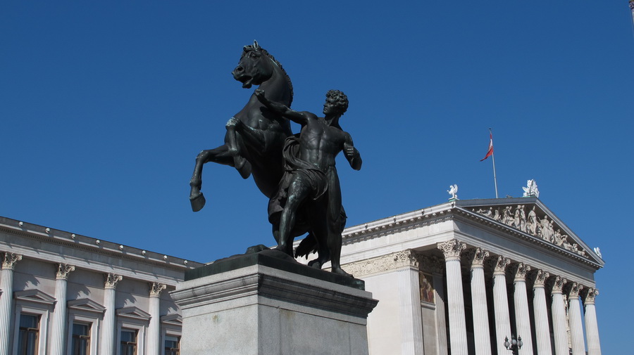 Parlament je vrlo reprezentativan sa širokim kosim prilazima na obje strane. Izgrađen u periodu od 1874. do 1884. godine u strogom neoklasicističkom stilu, djelo je danskog arhitekta Teophila Hansena. Osim forme antičkog hrama s korinstkim stupovima koji asociraju na Grčku kao kolijevku demokracije, najzanimljivije su skupine skulptura, radovi kipara Edmunda Hellmera: od brončanih skulptura Krotitelja konja u samom podnožju, preko niza mramornih skulptura grčkih i rimskih povjesničara prilikom uspona, sve do brončanih kočija i mramornih kipova antičkih učenjaka i državnika na krovu. Ispred parlamenta nalazi se Anthenebrunnen – fontana s likom božice mudrosti Atene Palade. Projektirao ju je Karl Kundmann na temelju idejne skice baruna Hansena, a postavljena je na rampi ispred parlamenta 1902. godine. Centralna figura božice Atene s pozlaćenom kacigom u jednoj ruci nosi koplje, dok u drugoj pozlaćenu figuru božice Nike. Ispod nogu Atene leže dvije ženske figure, alegorije zakonodavne i izvršne vlasti, a ispod njih četiri figure koje simboliziraju rijeke Dunav i Inn, Elbu i Vltavu.