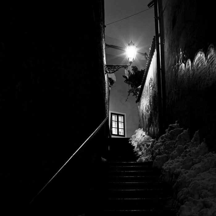 Nekolicinu fotografija karakterizira kompozicija gdje često oštri predmeti u tami svojim jasnim strukturama čine raster prvog plana dok je u pozadini difuzno osvjetljeni simbol grada poput katedrale, tržnice ili parka. Lirsku, gotovo kontemplativnu, notu sadrži fotografija Prozor jedne sobe do kojeg vode stare uske stube, karakteristične za Gornji grad, osvijetljene uličnim fenjerom. Na fotografiji Dverce dominira izvor svjetla koji svojom mekom disperzijom tek naznačuje svoju okolinu otkrivajući golo granje obližnjeg drveta, ugao stare fasade, djelić kockastog pločnika i ogradu iza koje slijedi gusta magla, te promatrač može samo nagađati što se iza nje krije. Sličan dojam ostavlja i fotografija Grič na kojoj je u kompoziciji definiranoj dominantnim crnilom naglašena središnja vertikala osvjetljenog prozora, ulaznih vrata u podnožju, te dvorišnih vrata čije gusto lišće formira luk vertikale svjetlosti.