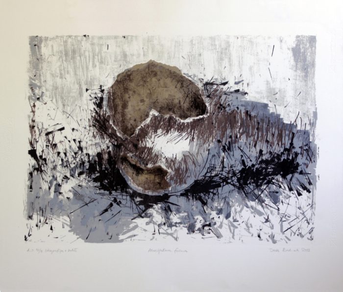Uzimanjem motiva ploda oraha kao izraza onostranog, Dora Bakek započinje seriju vizualizacije slika podsvjesnog i nesvjesnog. Tamo gdje je potrebna maksimalna sloboda da bi se putem automatizma i prvobitnosti reakcije zašlo u područje onostranog, autorica svjesno odabire tehniku dubokog tiska koja zahtjeva izrazitu promišljenost i trezvenost prilikom izrade, čime dolazi do kontradiktornosti između namjere i realizacije odabranog motiva.