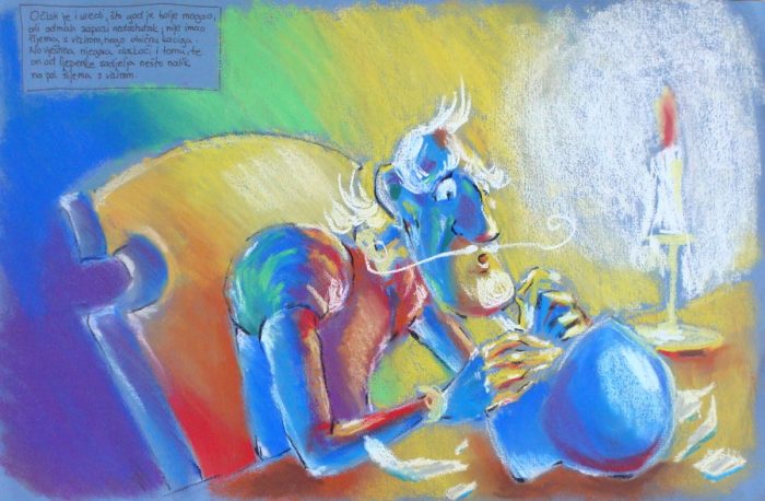 Energičnost, duhovitost i zaigranost autora očituju se u ilustracijama oblikovanim trenutnom inspiracijom koja se kroz proces nastajanja radova mijenja, a s njom i formati i primijenjene tehnike. Stalna promjenljivost i iznenađenja obrađenih literarnih djela karakteriziraju proces nastajanja njihovih likovnih interpretacija, zadržavajući time pažnju promatrača, te uvodeći ga sve dublje i dublje u imaginarni svijet autora.