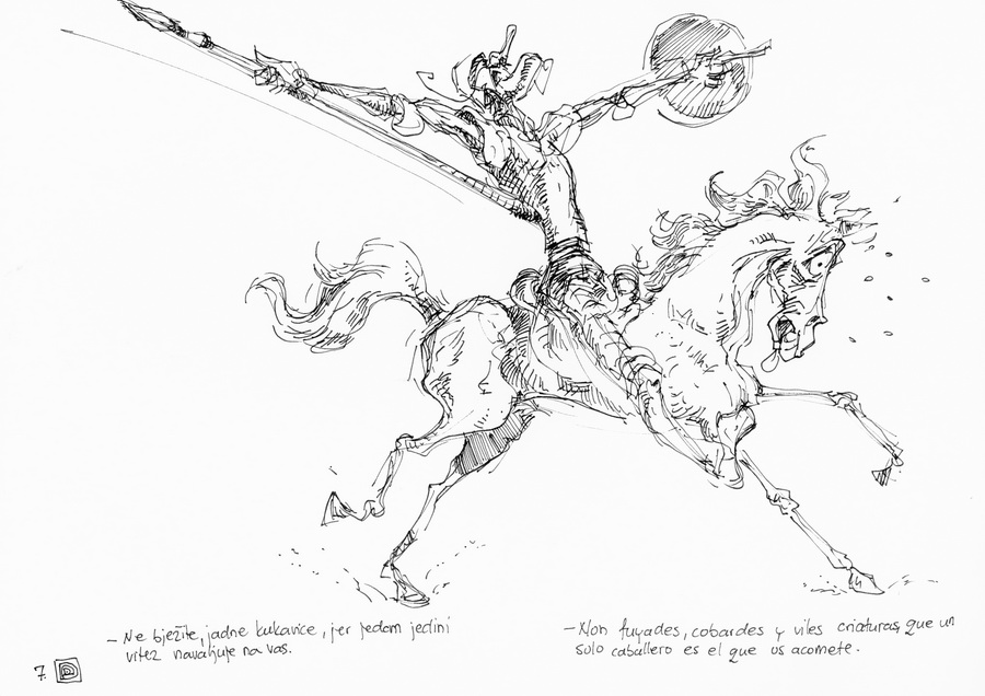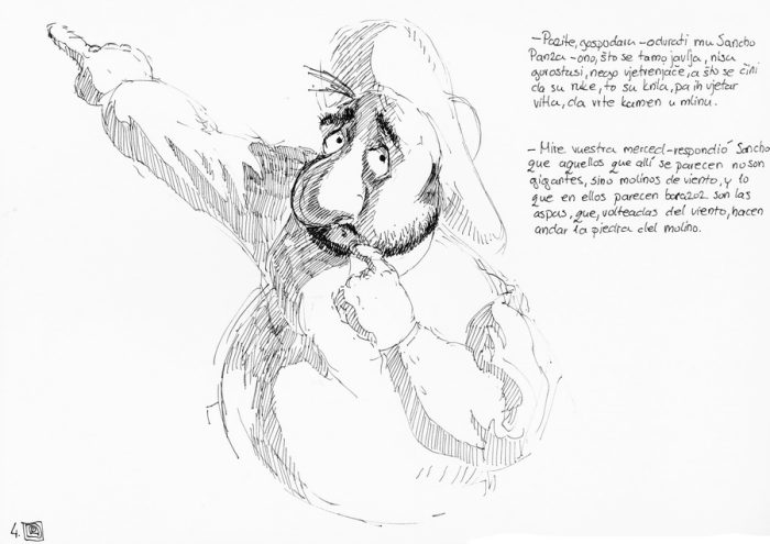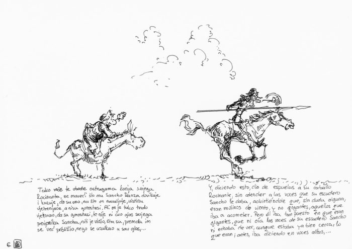 Dok su ilustracije komedije Dundo Maroje fokusirane na dinamične interakcije između likova, u crtežima Don Quijotea naglasak je na doživljaju poludjela glavnog lika. Iznimno uspjela karakterizacija lica dočarana je pomnim oblikovanjem specifične fizionomije: obrva, nosa, viteških brkova i brade. Naglasak na izražajnost pogleda svjedoči o autorovoj fascinaciji likom koji izgubljen u prostoru i vremenu usprkos vidljivom ludilu biva vođen idealističkim težnjama.