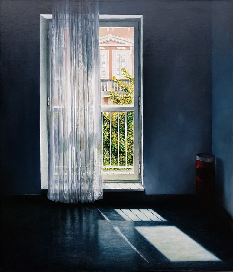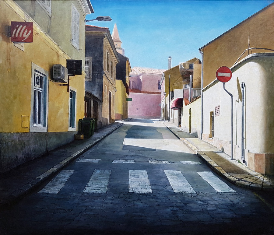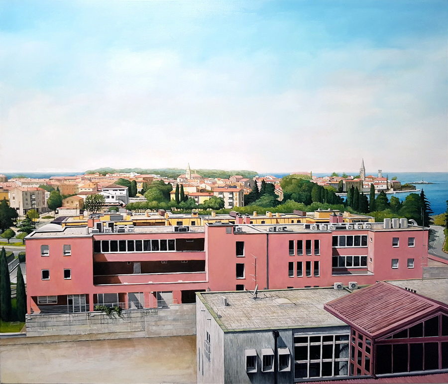 Ti urbani pejzaži, uključujući i neke druge motive, bili su dio moje borbe s motivima kojima inače nisam sklon. Na njima zaista nema prisutnosti čovjeka, jer u gradu u kojem trenutno živim postoji jedna čudna sinergija nestajanja ljudi. Ne u smislu irskog sindroma, nego je ritam Poreča bipolaran: zimi nestajemo, zatvaramo se u kuće dajući pritom gradu de Chiricovsku tišinu i prazninu, a ljeti se stopimo sa stotinama tisuća turista… U oba slučaja smo nevidljivi. Htio sam igrom sjena na fasadama, tamom poluotvorenih prozora i cestom napuklom od korištenja dočarati napetost praznog grada – grada koji čeka da se odjednom pojave ljudi, buka, djeca koja se igraju, babe koje viču, policajci i prodavači… ali nikako da izađemo i oživimo te ulice koje trebaju svoje stanovnike koji žive svoj grad.