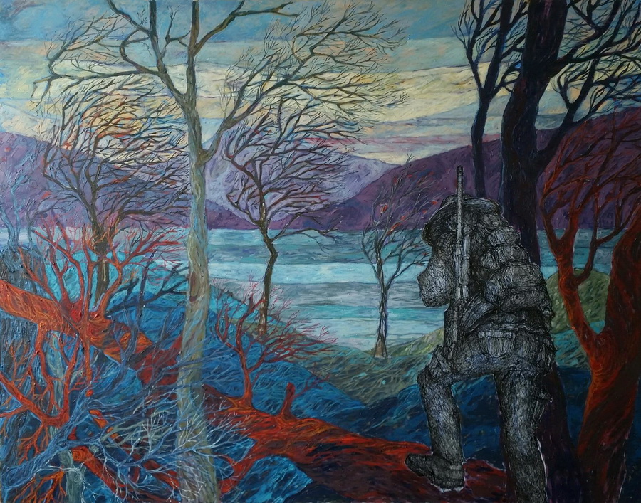 Našu otrgnutost od prirode i potpunu nesvjesnost njezine važnosti ponajbolje interpretira rad Šuma. Iako je naglasak, kao što i sâm naziv rada kaže, na prirodi, u crtežu je izveden motiv lovca i to namjerno prikazan kao da je naknadno inkorporiran u kompoziciju tj. kao da ne pripada šumi. Priroda je dočarana u zimskom periodu s golim granama koje se savijaju pod vjetrom dok irealni kolorit pridonosi zadivljujućem karakteru i bogatstvu prirode u svim njezinim godišnjim dobima. Ljudski lik ovaj put nije izveden mirno i precizno nanizanim linijama kao kod djedovina, već je struktura lika ispunjena krajnje nervoznim, živim, titravim i kontinuiranim potezom tuša. Ta uznemirenost linije dodatno potencira nepoželjnost lovca u šumi, ali i njegovu odlučnu namjeru kretanja prema unutrašnjosti iskazanu okretanjem leđa promatraču i aktivnim prodiranjem u divljinu.