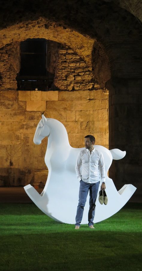 Skulptura konja postavljena je na travnatu podlogu koja prekriva cijelu površinu izložbenog prostora. Da bi posjetitelj došao do skulpture mora izuti svoje cipele i zakoračiti na travnatu površinu što je prvi korak dokidanja granica, izlaženja iz vlastite zone udobnosti i prizivanja emocija i uspomena iz djetinjstva, odnosno vremena kada smo svi bezbrižno i bez ikakvih susprezanja trčali po livadama. Umjesto sterilnog bijelog kubusa unutar kojeg posjetitelji u tišini hodaju i potiho razmjenjuju mišljenja o prezentiranim radovima ovakav način anuliranja normi i formalnosti omogućio je slobodniju i opušteniju atmosferu u izložbenom prostoru. Nakon što je ostvaren inicijalni korak dokidanja barijera i poniranja u samoga sebe na posjetitelju ostaje odluka koliko će dopustiti nesvjesnome u sebi da prizove sjećanja iz djetinjstva potencirana cjelokupnim ambijentom izložbe. Naglasak je stavljen na percepciju i doživljaj centralno postavljene skulpture konjića za njihanje kao arhetipskog motiva iz kolektivnog naslijeđa koji kod posjetioca na individualnoj razini pobuđuje različite emocije i sjećanja.