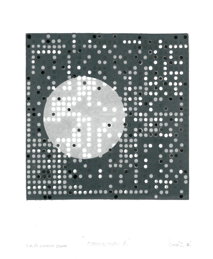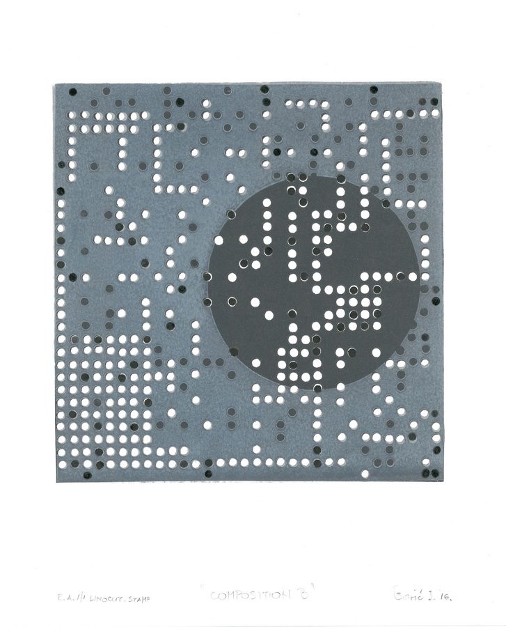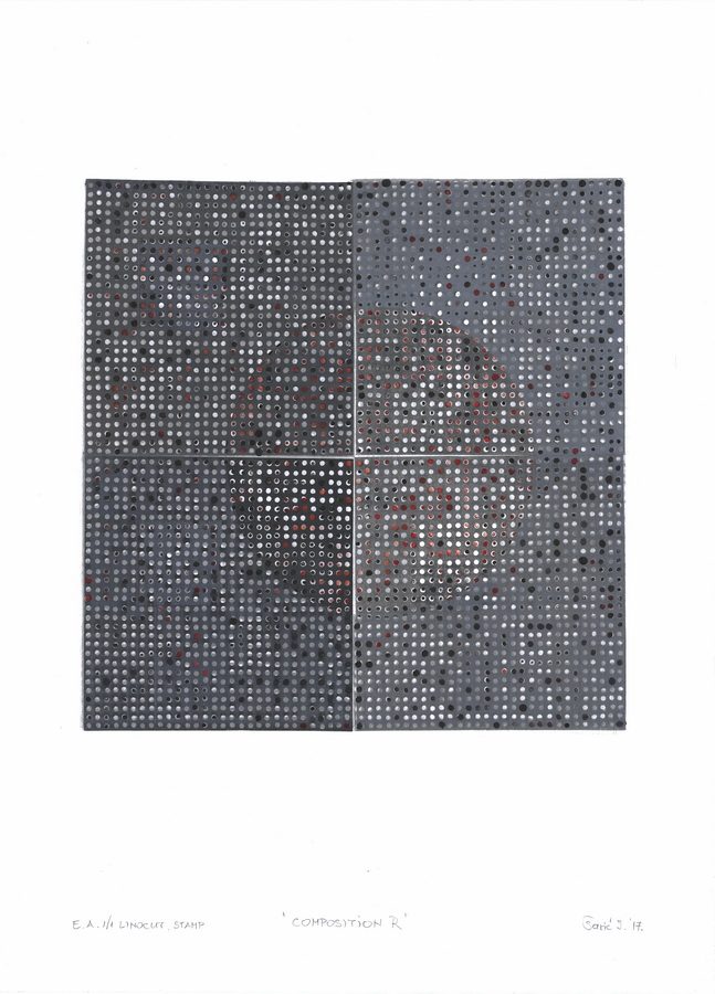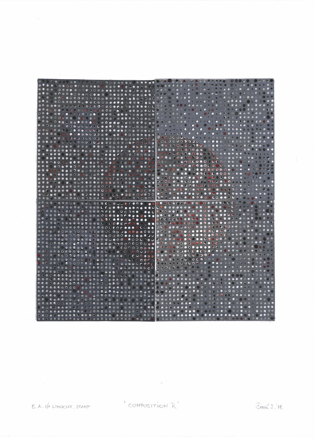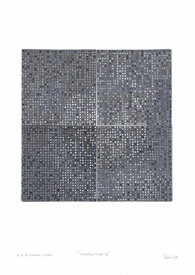 Proces razmišljanja o novim kompozicijama sastavljenim od uobičajenih elemenata često rezultira radovima koji predstavljaju dvije varijante istog koncepta utemeljenog na sličnostima ili suprotnostima. Primjerice, manji akromatski linorezi kvadratne forme ostvaruju komunikaciju kroz ritam krugova u bijeloj, sivoj ili crnoj boji. Cijelo kretanje u radu Kompozicija A uravnotežuje bijela kružnica koja poput negativna prekriva dio unutar tamnog kvadrata. Manji bijeli krugovi se tek naziru kroz opnu kružnice, dok crni prodiru u prvi plan. Kompozicija B svojevrsni je antipod Kompoziciji A. Podloga kvadrata je svjetlija, veća je koncentracija bijelih krugova, a kružnica je pozicionirana ispod, a ne preko putanje crnih i bijelih krugova.