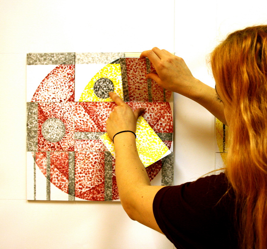 Kompozicija B i Kompozicija R varijacije su istog koncepta utemeljene na sličnosti i zorno prikazuju koliki utjecaj boja i zasićenost podloge mogu imati na konačan karakter rada. Kvadrat sastavljen od četiri jednaka segmenta objedinjen je kružnicom u središtu kompozicije. Upliv jedne boje “oživljava” akromatsku paletu, pa tako plava boja dodatno potencira sivu podlogu što rezultira tonski usklađenom Kompozicijom B, dok u Kompoziciji R crvena boja akcentuira toplinu zemljanih tonova stvarajući dojam gušće zasićenosti rada.