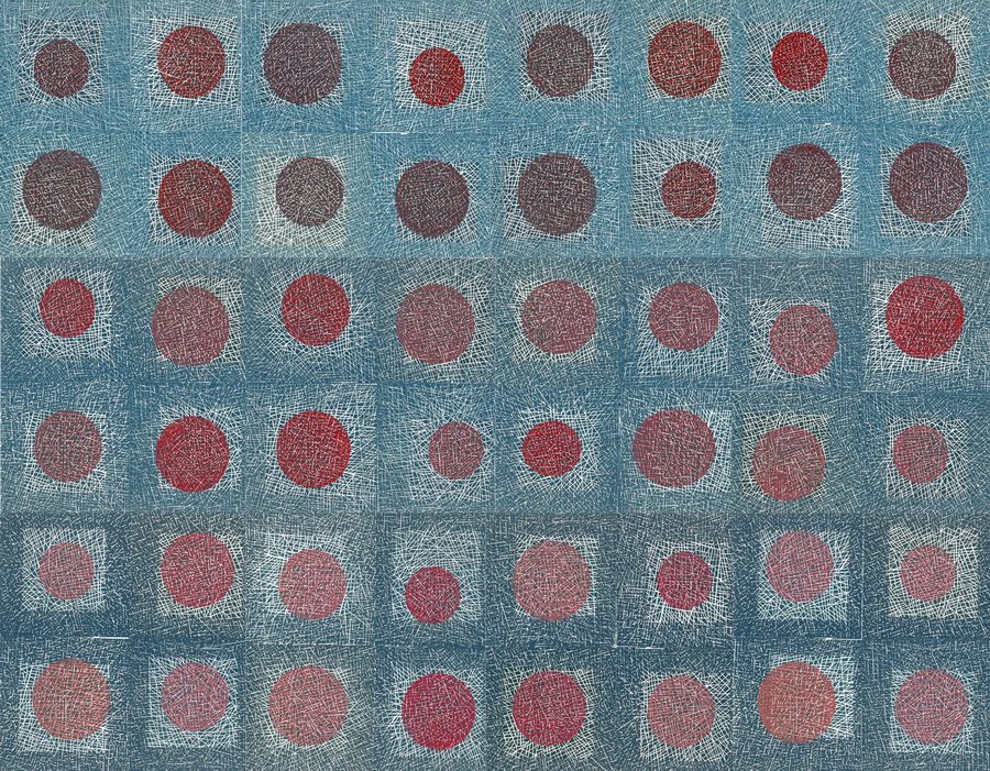 Zadržavajući se u polju istih gradivnih elemenata dolazi do promjene u samoj strukturi djela u radovima Red moves i Gra(y)vity of the rainy night. Podloga kvadratnog polja po prvi put ispunjena je gusto nanizanim linijama koje svojim međusobnim presijecanjem stvaraju jake nasuprotne silnice. Snažno gibanje unutar pojedinog kvadratnog segmenta uravnoteženo je formom kruga koji čini težište unutar kompozicije. Krugovi većih i manjih dimenzija, svjetlijih i tamnijih tonova određuju ritam stalnog kretanja unutar zgusnutog polja linija.