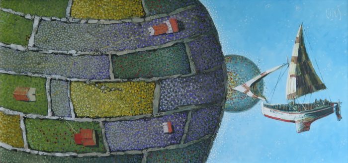 Ispreplitanje sna i jave, realnosti i fikcije, konkretnog i apstraktnog, svjesnog i nesvjesnog, te mogućeg i željenog doveden je do krajnjih granica u radu Naopako. Plavičaste brodice lebde na krvavo crvenoj materičnoj pozadini približavajući se otoku posve iskrivljenih proporcija i perspektive. No, unatoč svim tim nelogičnostima promatrač i dalje s lakoćom prati zbivanja na slici.