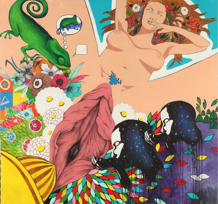 Alisa Ramić provokativno i direktno interpretira poziciju žene u društvu ilustrirajući vaginu u predimenziniranom obliku čineći ju matičnim fokusom slike. Dekorativna površina djela podsjeća na popartistički plakat naglašene plošnosti i snažnog kolorita. Niz simboličkih motiva, redom muških protagonista, te kameleona koji razmišlja o seksualnom činu okruženi su gusto naslikanim šarolikim cvijećem – čestim motivom koji se stereotipno veže uz ženski spol. Isti je prisutan i u kosi depersonalizirane žene čija bjelina očiju lišava promatrača mogućnosti iščitavanja njezine duše i karaktera. Nagog tijela u ležećem položaju protagonistica s cvijećem u kosi i cigaretom u ustima aludira na djecu cvijeća i seksualne slobode, ali i posljedice seksualiziranog svijeta. Vagina postaje simbol žene. Ona je središte zbivanja, nedostižni cilj i izazov svakom muškarcu. Nebitnost njezine duše naznačena je kompozicijskim postavljanjem svih ključnih motiva oko preuveličane vagine. Zloslutne maske u obliku falusa svjedoče o nevažnosti karaktera muških pojedinaca, personalizacija je potpuno nebitna, sve se svodi na seksualni čin – on postaje opsesija.