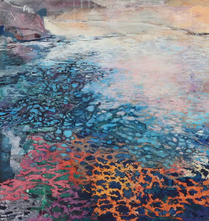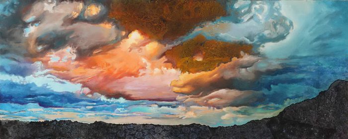 Promatrajući dva pejzaža Jelene Copak zajedničku sponu pronalazimo u sličnom koloritu, dok kod pristupa temi i tretiranju površina autorica inspiraciju pronalazi u raznim eklektičnim stilovima. Kod naglašeno horizontalne kompozicije dominantnog plamtećeg neba pod nazivom Čevo indirektne reminisencije na Williama Turnera vidljive su u naglašenom koloritu i izraženim efektima kontrasta boja. Dramatika neba pojačana je uvojitim, gotovo centrifugalnim gibanjima u samom središtu slike, dok ornamentalni uzorak na brončanom koloritu neba čini poveznicu s gotovo plošnom ornamentalno ukrašenom površinom crne planine čija linija uravnotežuje kompoziciju dajući joj stabilan umirujući okvir. Naglašeni kolorit neba ponavlja se na slici Bednja u mrežastom rasteru papira apliciranog na površinu slike koji postepeno blijedi prelazeći u svijetle neutralne tonove u daljini. Gotovo apstraktna površina s naglaskom na sam proces oblikovanja i teksturu djela definirana je naznačenim krajolikom te samim nazivom slike.
