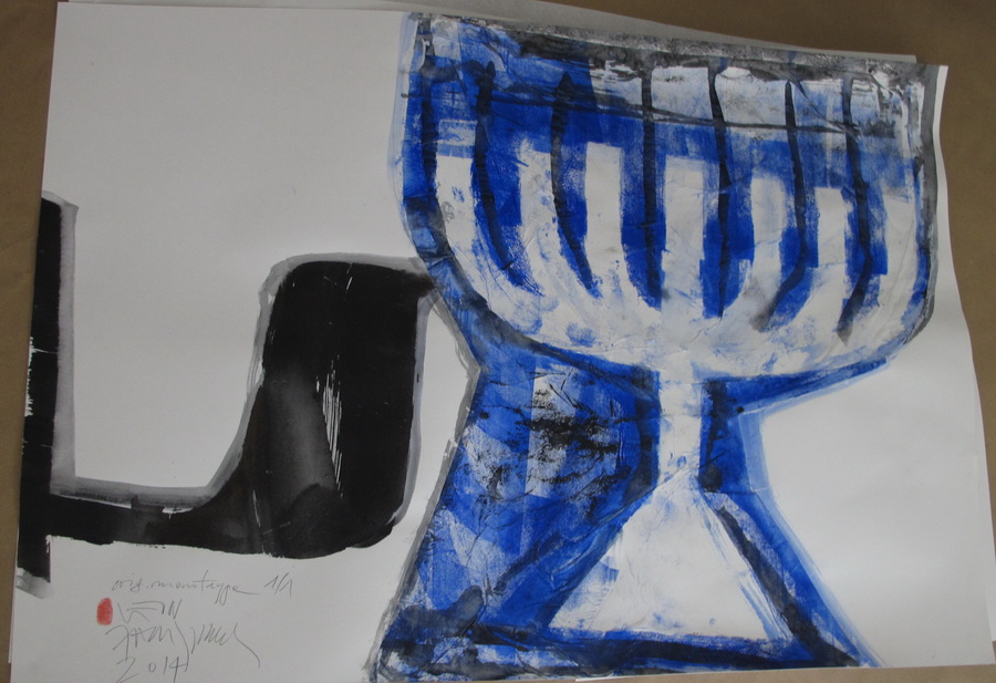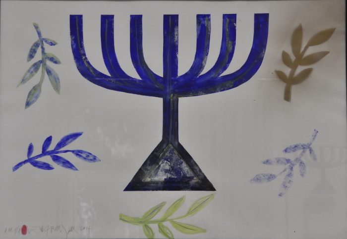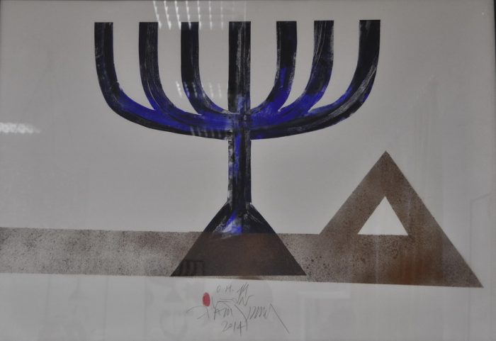 Zadržavajući smireni crtež on oblikuje glavne simbole judaizma – Davidovu zvijezdu i menoru. Glavni znak identiteta židovskog naroda, nastao spajanjem dva trokuta čime se formira heksagram, označava prožimanje i pomirenje dvije suprotne strane života: neba i zemlje. Snažna simbolika trajnosti, nepromjenjivosti i mudrosti sadržana je u svjetlu menore implicirajući svjetlost Tore. Menora preuzima ulogu snažnog grafičkog znaka, dok popratni simboli igraju funkciju dizajnerskih komponenti doprinoseći umjetničkoj slobodi u organizaciji simbola.
