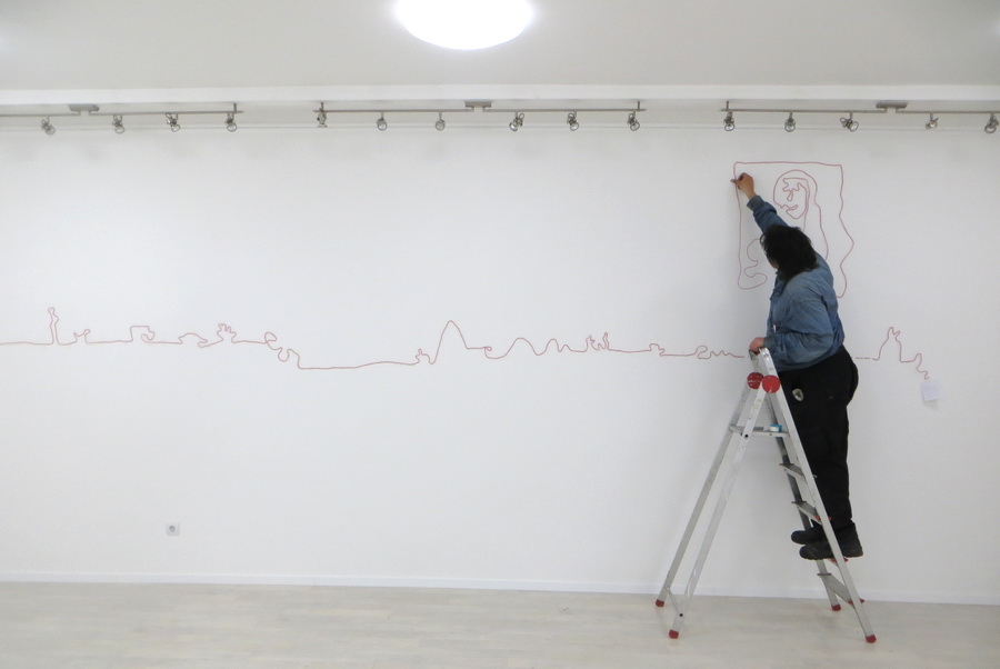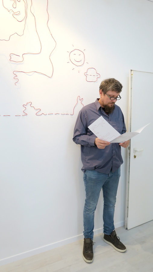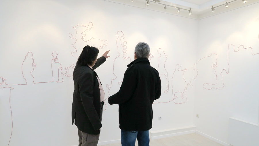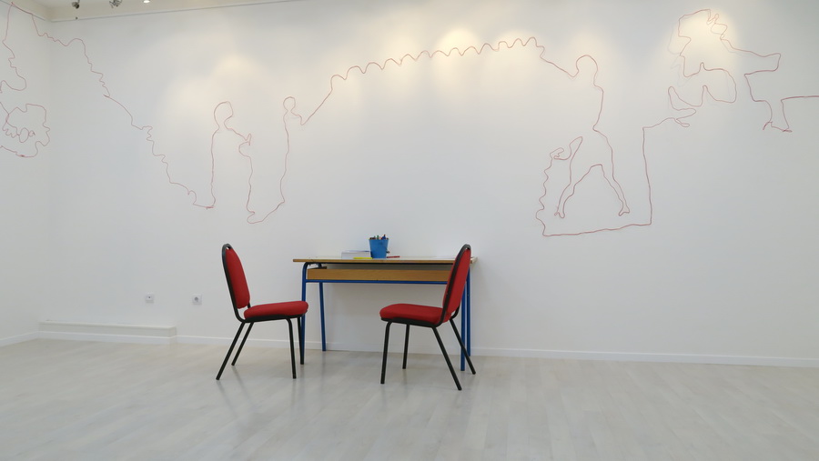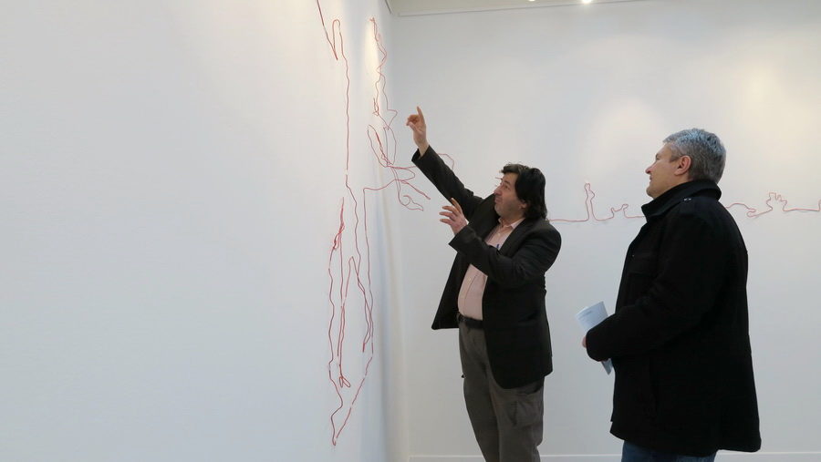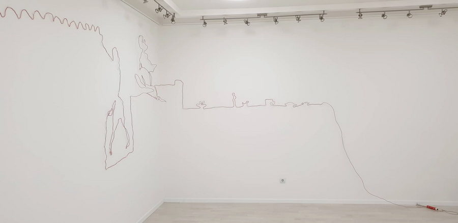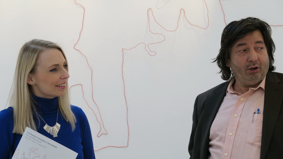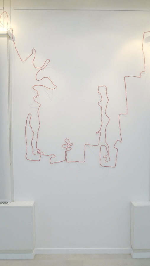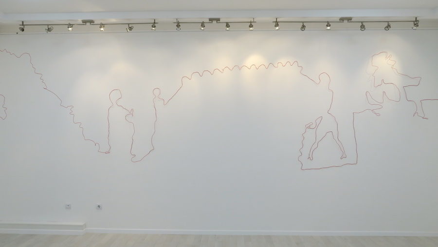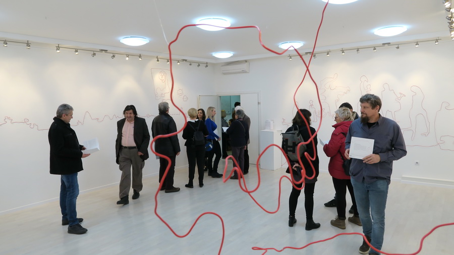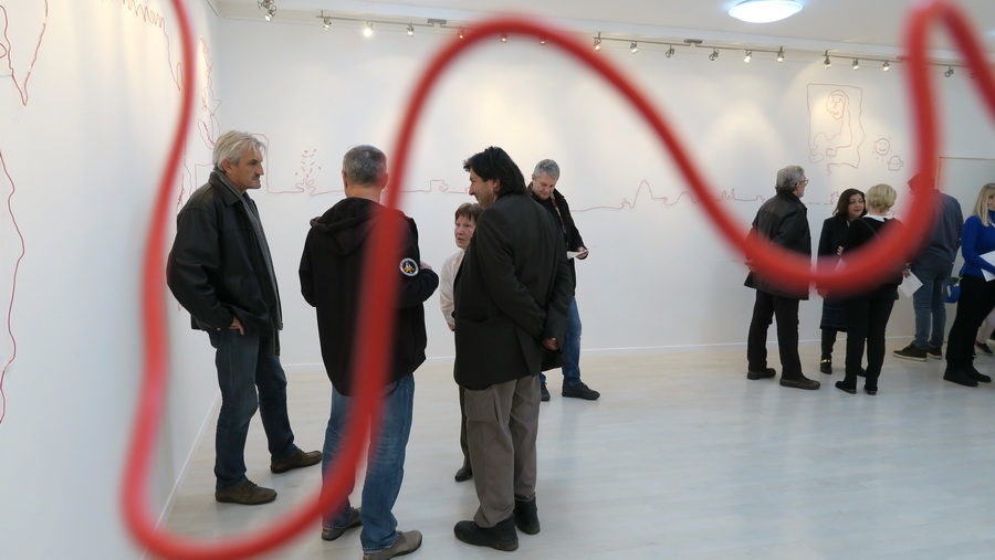 Ostajući vjeran svom prepoznatljivom rukopisu Leonardo Budimlić Majnarić realizira prostornu instalaciju u formi linijskog crteža “iscrtanog” kontinuitetom upotrijebljene crvene žice. Koristeći bijele zidove izložbenog prostora galerije umjetnik gradi priču počevši od arhetipskih motiva teme postanka preko svakodnevnih životnih situacija do prikaza otuđenog pojedinca izgubljenog u bespućima kapitalističkog svijeta u kojem danas živimo. Dinamika crteža ostvarena je prepoznatljivom nemirnom linijom karakterističnom za Leonardove kroki crteže na papiru i tabletu, dok odabir crvene boje aludira na pulsirajuću snagu, krvotok života čiji je ritam definiran usponima i padovima, neočekivanim događajima, te interakcijom i odnosima s pojedincima koji su dio našeg života. Linijski crtež crvenom žicom uvjetovan je prostornim zadatostima galerije. Položaj prozora određuje svojevrsne pauze u gradnji priče iako se kontinuitet crteža ne prekida. Područje između prozora poslužilo je za realizaciju intimnijih tema s manjim brojem aktera, dok duži kontinuirani zidovi postaju mjesto razrade kompleksnijih tema s više različitih karaktera i događaja.