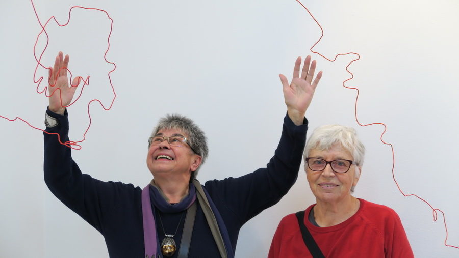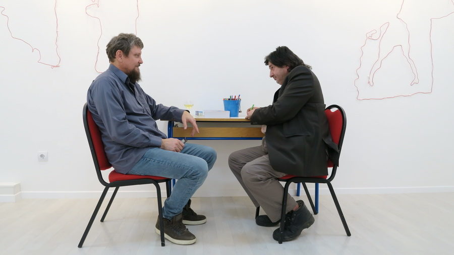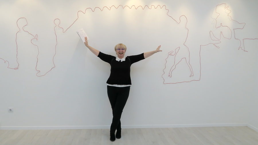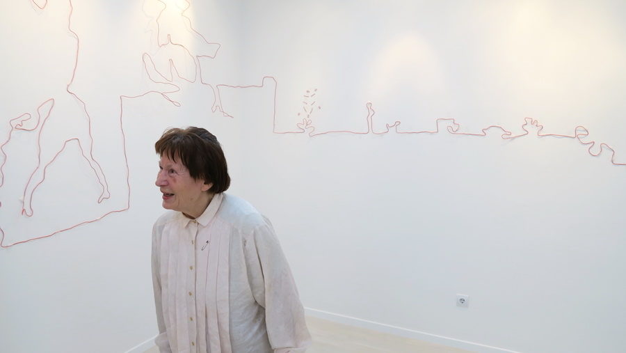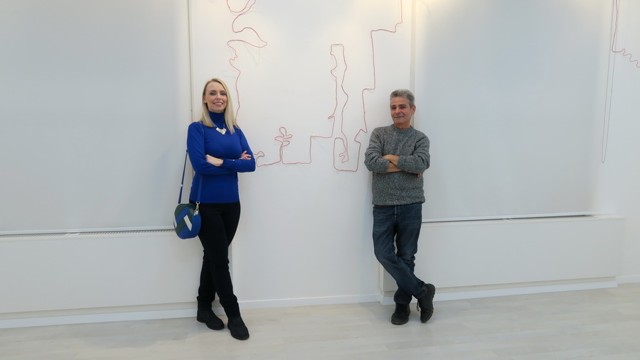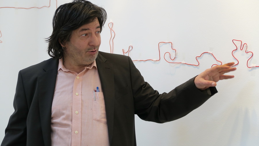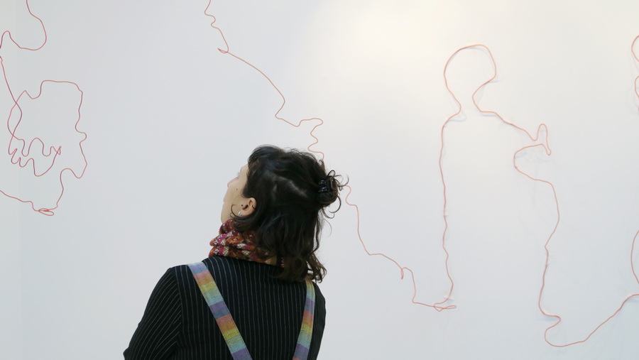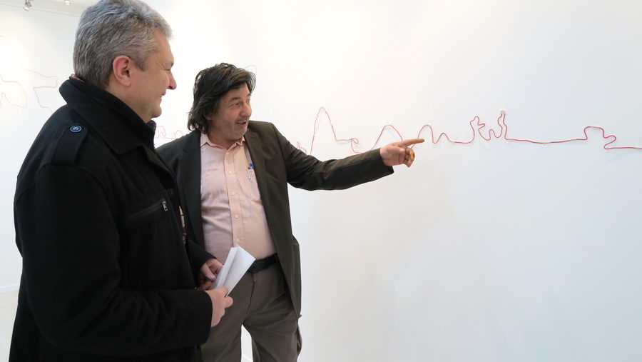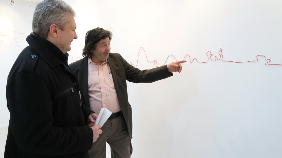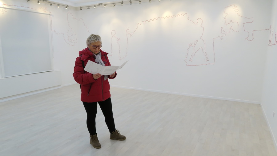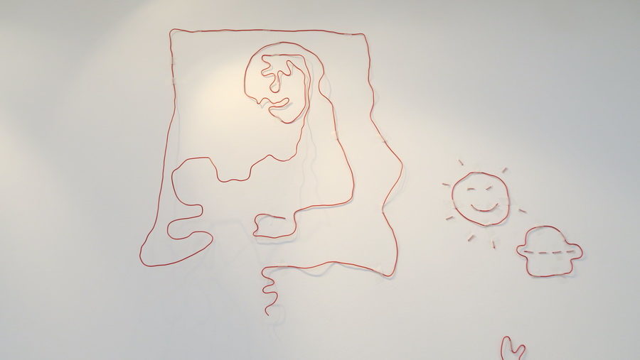 Ostajući vjeran svom prepoznatljivom rukopisu Leonardo Budimlić Majnarić realizira prostornu instalaciju u formi linijskog crteža “iscrtanog” kontinuitetom upotrijebljene crvene žice. Koristeći bijele zidove izložbenog prostora galerije umjetnik gradi priču počevši od arhetipskih motiva teme postanka preko svakodnevnih životnih situacija do prikaza otuđenog pojedinca izgubljenog u bespućima kapitalističkog svijeta u kojem danas živimo. Dinamika crteža ostvarena je prepoznatljivom nemirnom linijom karakterističnom za Leonardove kroki crteže na papiru i tabletu, dok odabir crvene boje aludira na pulsirajuću snagu, krvotok života čiji je ritam definiran usponima i padovima, neočekivanim događajima, te interakcijom i odnosima s pojedincima koji su dio našeg života. Linijski crtež crvenom žicom uvjetovan je prostornim zadatostima galerije. Položaj prozora određuje svojevrsne pauze u gradnji priče iako se kontinuitet crteža ne prekida. Područje između prozora poslužilo je za realizaciju intimnijih tema s manjim brojem aktera, dok duži kontinuirani zidovi postaju mjesto razrade kompleksnijih tema s više različitih karaktera i događaja.