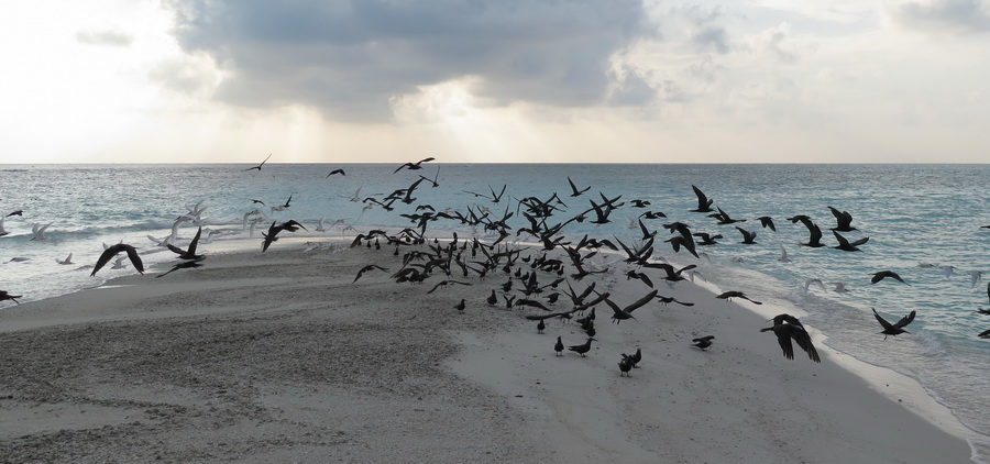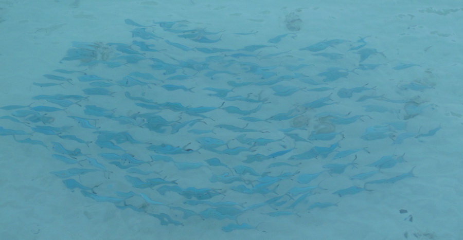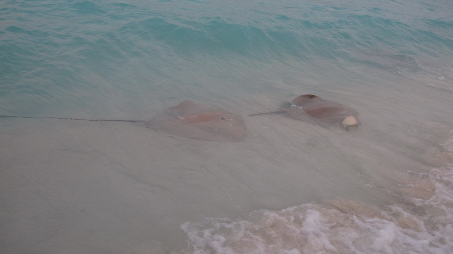 Vidjeli smo i veličanstvene raže, ali ne prilikom ronjenja već su na otoku imali organizirano hranjenje raža. Čovjek bi ušao u vodu do koljena i oko njega bi se okupio popriličan broj reprezentativnih primjeraka raža koje su čekale svoj zalogaj. Došli bi naravno i morski psi vidjeti ima li koja poslastica za njih. Smiješni su bili buljooki rakovi (još jedan stručni termin) koji su čekali na plaži da zgrabe ostatke, kao i čaplje u daljini, vjerojatno zadnje u lancu grupnog hranjenja.