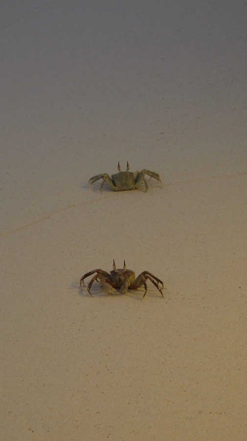 Tijekom popodnevnog odmora uz koktele u baru smještenom na samoj plaži imali smo svakodnevno društvo malih sramežljivih račića koji se sa svojim školjka kućicama bojažljivo kreću samo kada ne osjete vibracije i ne vide nikoga u blizini. Ako ste dovoljno strpljivi i pričekate uz njih, nakon nekog vremena će se okuražiti i izviriti da vide je li zrak čist za prolazak. Postoje i rakovi koji su aktivni većinom po noći, pa kad ujutro dođete na plažu vidite hrpu rupa u pijesku koje su oni iskopali, a ako idete u večernju šetnju plažom vidjet ćete čitave kolonije rakova kako vam bježe pod nogama i skrivaju se u te iste rupe. Smiješni su, bijeli s ispupčenim očima, hodaju bočno i vrlo su brzi. Vjerojatno sam zaboravila još hrpu životinja, ali s ovima smo se često susretali uživo, pa su mi ostale u sjećanju.