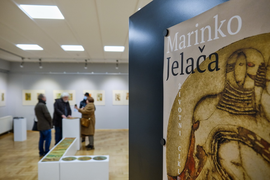 Vođen zen filozofijom koja nalaže kako istinu možemo otkriti samo ako prestanemo oponašati i počnemo ozbiljno istraživati, te nikako ne odustanemo od traženja odgovora na temeljna životna pitanja i izazove, Marinko Jelača posvećuje se istraživanju života kroz umjetnost prepuštajući jarkim toplim bojama i zemljanim tonovima da emaniraju bilo života. Na pitanje “Što je to život?” umjetnik odgovara ciklusom koji dijeli u nekoliko tematskih cjelina: uterus, godovi, sacra, anima i homo unutar kojih interpretira postulate života. Pulsirajuće titrave linije i plohe kroz koje kola život formiraju arhetipske oblike koji bude reminiscenciju na odveć poznato, blisko, a opet nepoznato, jer smo se godinama, desetljećima i stoljećima sustavno distancirali od počela. Splet formi, oblika i likova koji poput negativa izviru iz površine zasićene jarkom narančasto-crvenom ili žuto-zelenom magmom naznaka su obrisa ljudskih likova, ptica, riba, ali i prethistorijskih bića o čijem smo postojanju spoznali putem fosilnih ostataka. Uterus kao simbol plodnosti, zaštite i snage ukazuje na neraskidivu sponu između ljudskih bića, ali i čovjeka i prirode. Životni godovi koncentričnim krugovima predočuju stupnjeve bitka, dok anima i homo ukazuju na nemogućnost određivanja granice između umjetnosti i života, čovjeka i prirode, te prirode i umjetnosti. Marinko Jelača ne opisuje već likovno bilježi utiske života kroz motiv ptice kao simbola duše, vodenih stvorenja kao božanstava, ribe kao simbola života i mudrosti, te čovjeka kao personifikaciju svemira u malom. Kroz tematske cjeline javljaju se objedinjujući elementi: srce odnosno pojam duhovnog i osjećajnog središta ljudskog bića, trokut kao znak trojnosti (tijelo, duša i duh), te krug kao simbol savršenosti, homogenosti i cikličnosti života. Dinamične kompozicije nizanjem linijski povezanih likova i formi djeluju poput kodiranih slika – što ih dulje promatramo, to se više otvaraju pojedini oblici i sadržaji. Ritam prikaza je potenciran izmjenom dominantnog linijskog crteža te mrljastih ploha ispunjenih bojom. Ljudske i životinjske figure djeluju praiskonski – kao da su preuzete iz nekih drevnih zapisa. Forme bude reminiscenciju na kolektivno sjećanje svojim prepoznatljivim elementima, no potom se stapaju ili rastaču u apstraktne oblike koji su poveznica s ondašnjim, podsvjesnim i nematerijalnim. Naglašeno je vertikalno gibanje koje ukazuje na povezanost neba i zemlje, duhovnog i tjelesnog, čovjeka i prirode, prirode i umjetnosti. Apstraktne forme su razvedene i kompleksne poput nutrine bića odnosno njegove duše.