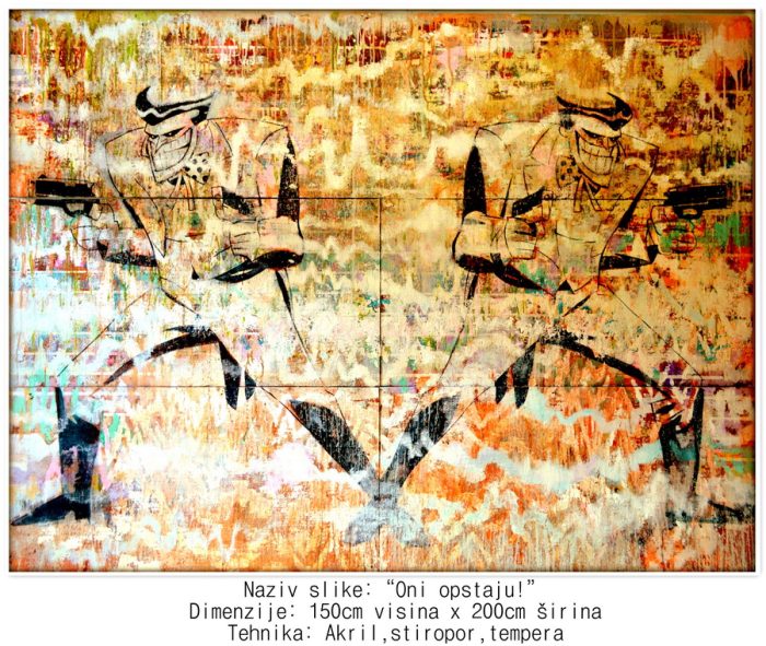 Kroz motiv superjunaka na slici “Oni opstaju” Romoda komentira odnos umjetnosti i pop kulture. Ne zadržavajući se na ispraznoj površinskoj zanimaciji koju superjunaci na prvi pogled obnašaju, on uzima simboliku iz filma Batman u kojem Joker svjesno uništava veću količinu novaca poništavajući time njegovu relevantnu ulogu u čovjekovom životu. Kako superjunaci uz nadnaravne sposobnosti i moći često utjelovljuju visoke moralne vrijednosti, Joker u ovom prikazu utjelovljuje borca protiv egoizma, snobizma, materijalizma, akademizma, aristokracije i ispraznosti koja se krije iza svih pompoznih titula. Iščitavajući kompleksnije slojeve i poruke Mario Romoda kritizira uštogljenost, demagogiju i priznavanje veličina u društvu koje su zdravo za gotovo prihvaćene kao vrhunska kvaliteta bez propitivanja jesu li uopće zaslužile taj položaj.