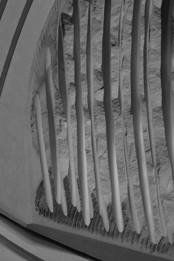 Sva zbivanja koncentrirana su isključivo na prednjoj strani skulpture. Stražnju stranu autor ostavlja slobodnom za svoj karakterističan potpis. Neobrađena stražnja strana tipična je za reljef, koji je njome obično vezan za podlogu. Ovakvim nesvakidašnjim i inovativnim pristupom umjetnik priziva asocijativnost i obradu kamena koja je svojstvena reljefu.