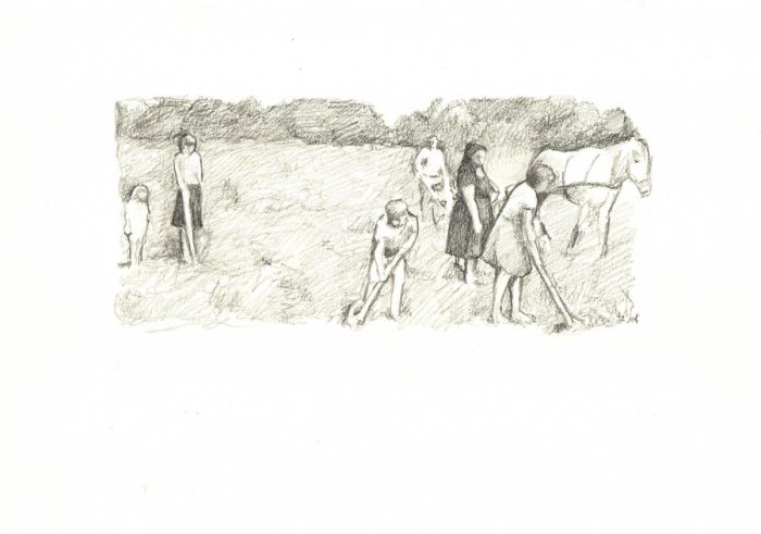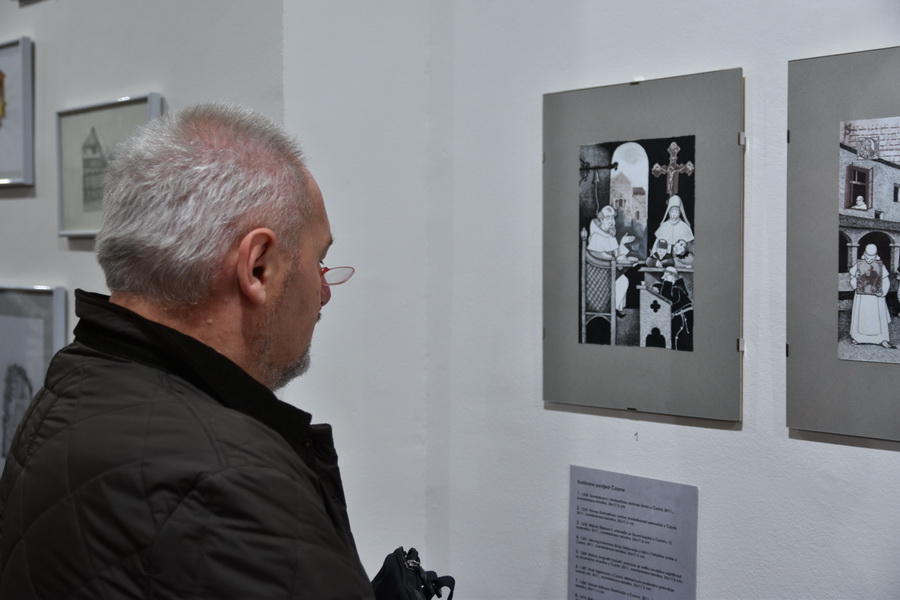 U mediju olovke umjetnik realistično prikazuje ljude i različite vizure prirode, dok jedini akvarel na izložbi utjelovljuje živopisni prikaz veselog dječaka u skoku. Promatrajući ilustracije razvidno je kako se umjetnik primarno vodio mišlju kako utjeloviti atmosferu i emocije koje se vežu uz pojedino sjećanje i iskustvo fratra.