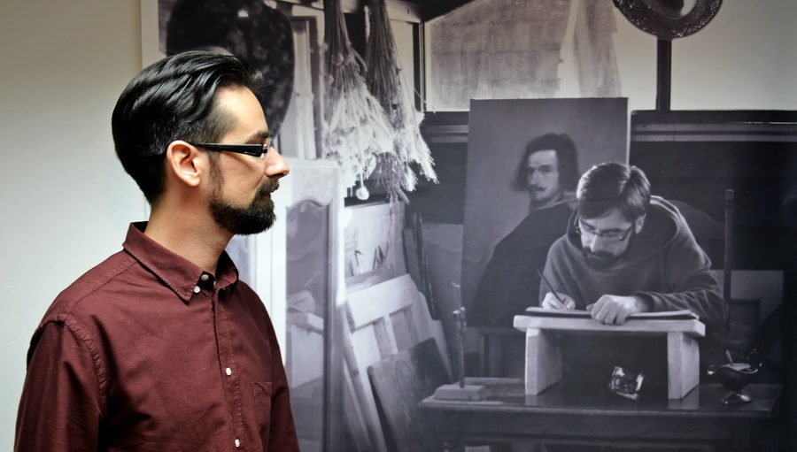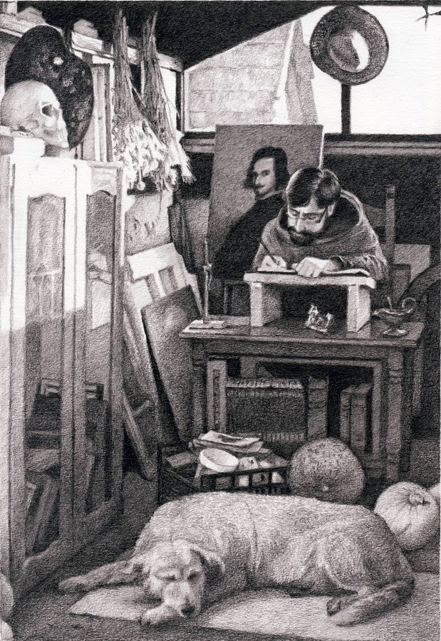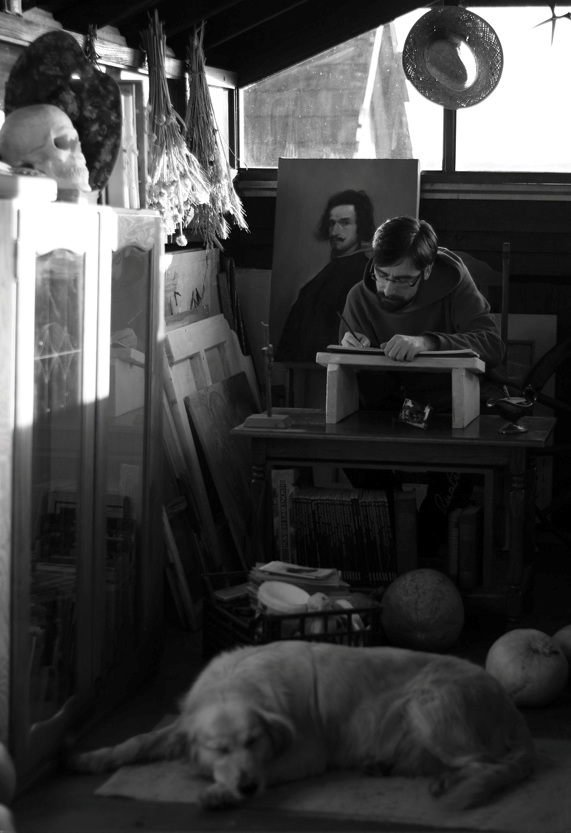 Osim povezivanja prošlosti i sadašnjosti, svetosti i ljudskosti kroz medij umjetnosti, Matko Antolčić stvara radove u kojima dopušta promatraču ulazak u svoj osobni svijet. Fotografija “U ateljeu” nastala je po uzoru na poznatu majstorsku gravuru Albrechta Dürera “Sveti Jeronim pri učenju”. Rad za koji je povjesničar umjetnosti Johann Konrad Eberlein rekao “gravura u čijoj se nepromjenjivoj teksturi uloženo vrijeme pretvorilo u trajnu umjetnost” potaknuo je Antolčića da otvori vrata svog ateljea i dopusti ulazak u vlastiti radni prostor. Sveti Jeronim, kojeg je Dürer crtao više nego ijednog drugog sveca, utjelovljenje je božanskog otkrivenja u potpunoj izolaciji. Takvu vrstu izolacije pronalazimo i kod umjetnika koji tijekom stvaralačkog procesa dolazi u doticaj s transcendentalnim. Gravura na kojoj je umijeće ulaska sunčeve svjetlosti kroz rešetkasti prozor hvalio čak i slavni Giorgio Vasari interpretirana je u mediju koji svjetlom bilježi sadržaj. Fotografija utjelovljuje duh starih ateljea ispunjenih najraznolikijim artefaktima, umjetninama, knjigama i vitrinama. Vrlo važnu ulogu ima svjetlost koja dolazi sa stražnje strane i osvjetljava tek dio prostora, tako da većina ateljea ostaje u mraku. Lav iz prikaza sv. Jeronima zamijenjen je motivom psa, vjernog čovjekovog suputnika u današnjem svijetu. Glavni pečat djelu daje naglašena koncentracija umjetnika na rad neometena fotografskom bilješkom iz prikrajka.