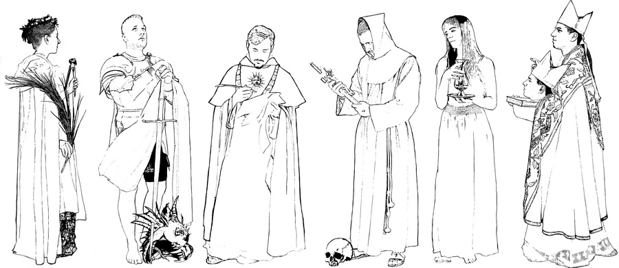U radu “Svetački identitet” crtež većih dimenzija čini cjelina od šest svetaca interpretiranih na temelju fotografija modela u ulogama određenih svetačkih likova. Za razliku od Francisca de Zurbarána koji je svoje likove svetaca smještao u nejasne prostore gradeći kompoziciju snažnim kontrastima između tamnih i osvijetljenih dijelova slike, Matko Antolčić odstupa od uzora i svece oblikuje linearnim crtežom u tušu. Naglasak stavlja na atribute, odnosno simbole pojedinog sveca koje izvodi s mnoštvom detalja. Crtež lišen bilo kakve pozadine i prostora pažnju usmjerava na karakter pojedinog interpretiranog sveca. Uzimajući obične ljude koji karakterno odgovaraju osobama koje su radi svog načina života posvećenog Kristu proglašene svetima, autor u svojem radu spaja ljudsko, uzvišeno i božansko.