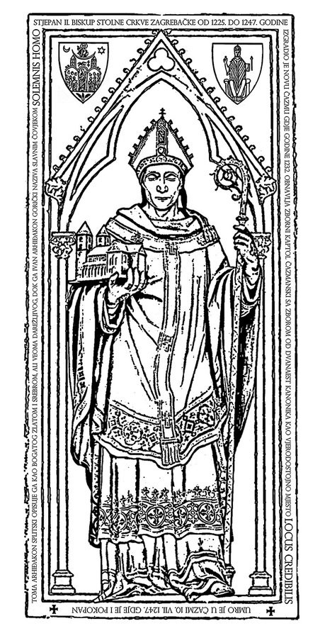 Jedini rad s naglašeno povijesnom tematikom prijedlog je za spomen ploču Stjepana II. koji je odigrao značajnu ulogu u srednjovjekovnoj Čazmi. Inspiraciju za rješenje spomen ploče Antolčić pronalazi u nadgrobnoj ploči francuskog arhitekta Huguesa Libergiera. Poveznica je ondašnji gotički stil u čijem duhu umjetnik osmišljava linijski crtež biskupa koji drži crkvu kao simbol biskupije.
