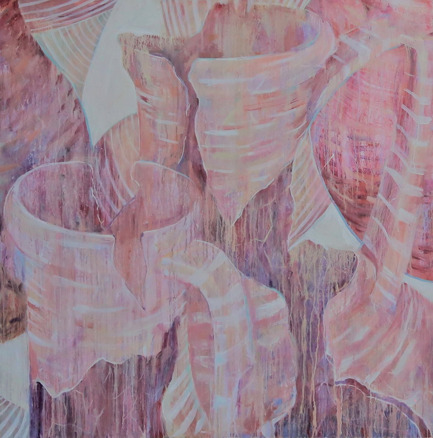 Sličan tretman i pristup obradi motiva umjetnica primjenjuje i u prikazu amfora, glinenih posuda u kojima se u antici čuvala i prenosila hrana, odnosno blago neophodno za život. Tonsko oblikovanje ljudskog tijela u nježnim toplim ružičastim tonovima Natalia Borčić primjenjuje i u oblikovanju fragmenata amfora čija krhka i popucala površina asocira na ljudsku kožu obilježenu protokom vremena. Amfore tako postaju opne koje čuvaju blago kao što fizičko obličje tijela čuva ljudsku dušu.
