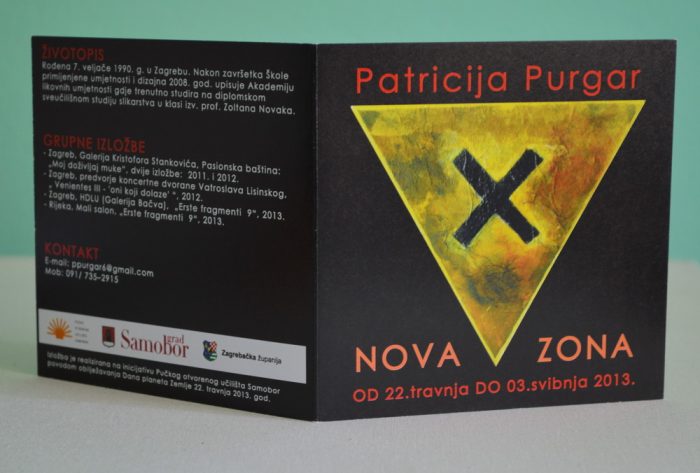 ...Patricija Purgar “Nova zona” 22.04.-03.05.2013., Predvorje samoborskog kina Odnos prirode i čovjeka jedan je od najkompleksnijih odnosa koji se kontinuirano mijenjao kroz povijest. Suvremenim načinom života čovjek stavlja sebe u samo središte. Posljedica takvog odnosa prema prirodi brojne su prirodne katastrofe, koje ukazuju na činjenicu da takav tempo iscrpljivanja prirode neće moći još dugo trajati.