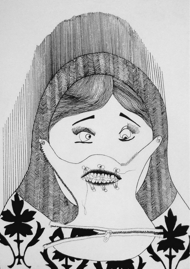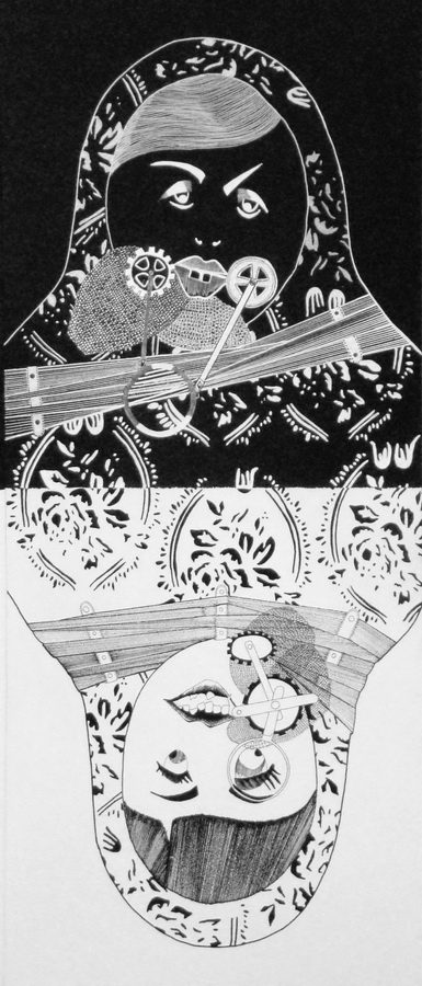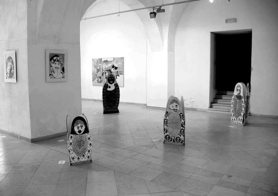 Lik babuške pamtimo kao tradicionalnu drvenu igračku bez ruku, ozarena lica i jarkih boja narodne nošnje. Slađana Zubić motiv babuške svodi na akromatski prikaz baziran na suprotnostima zadržavajući nježne oblike raznovrsnog cvijeća kojima, pak, suprotstavlja geometrijske uzorke. Blage valovite frizure našminkanih lica remete grube, hladne i nasilne sprave koje izvlače trpni osmijeh likova.