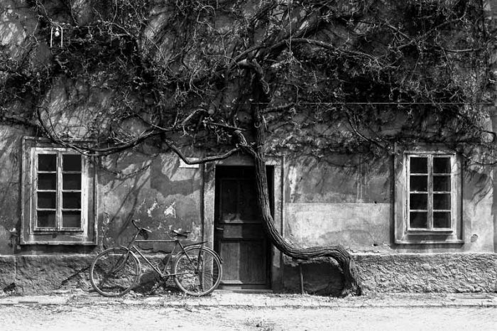 Osim odnosa svjetla i sjene, zanimljive su fotografije s dominantnim strukturama koje grade kulisu zbivanja poput bršljana na fotografiji U dvorištu gdje se djevojčica igra s hula-hopom ili kružnih oblika kotača raznih veličina koji ispunjavaju oronuli zid grube teksture na fotografiji Mali popravak.