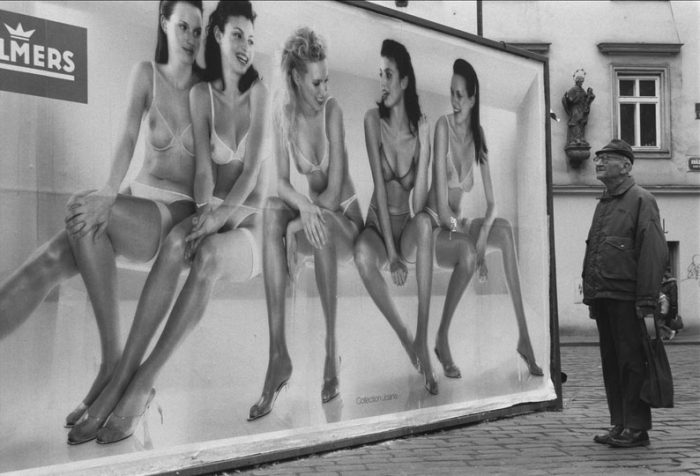 Bilježenje velikih zidnih uličnih reklama i interakcije prolaznika s istim govori o autorovoj znatiželji da pronikne u psihologiju ljudskog uma. Vrebajući leopard na plakatu, čijoj živopisnosti pridonosi sjena krošnje stvarnog drveća koja spaja imaginarni i stvarni svijet, oblikuje pozadinu beskućnika dok priprema svoju posudicu za sitniš. Samozatajni smiješak starijeg gospodina kojeg je izmamio pogled na mlade djevojke u prozirnim grudnjacima na plakatu za Palmers sličan je prizoru biciklista koncentriranog na niz fotografija zanosne plavuše na reklami za donje rublje. Sve su to zabilježbe strpljivog promatrača i analitičara ljudskih priča.