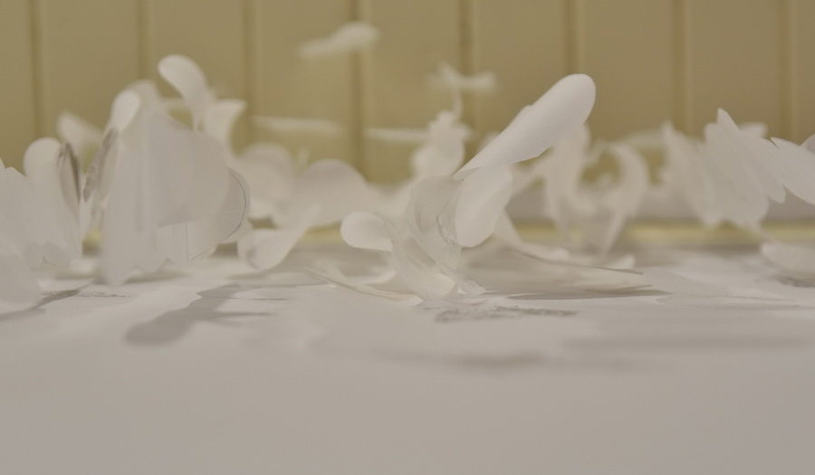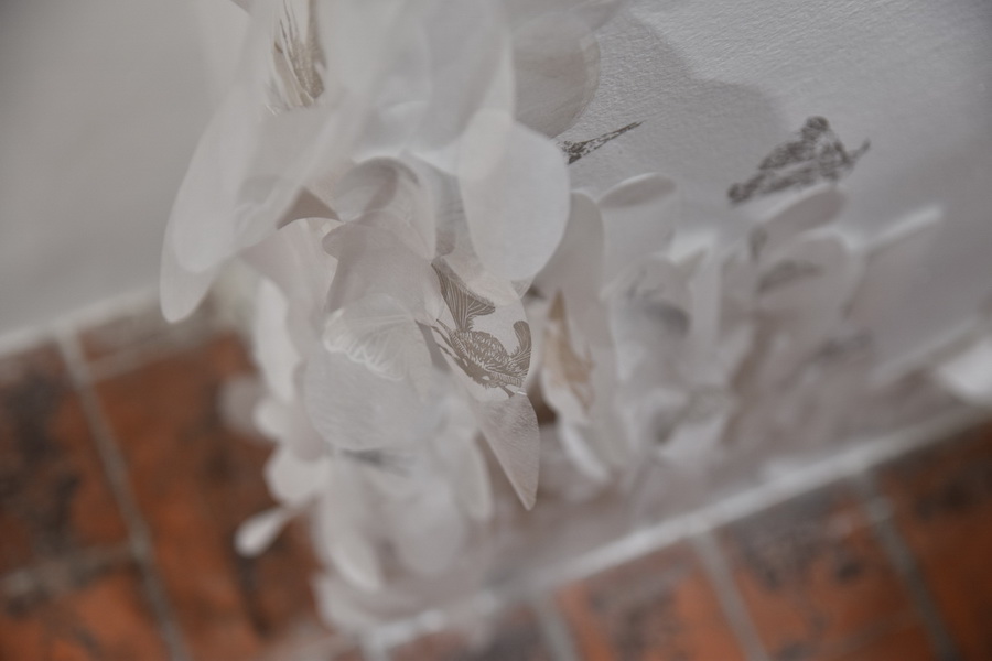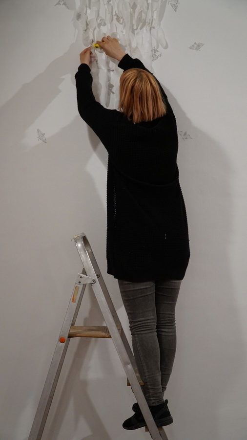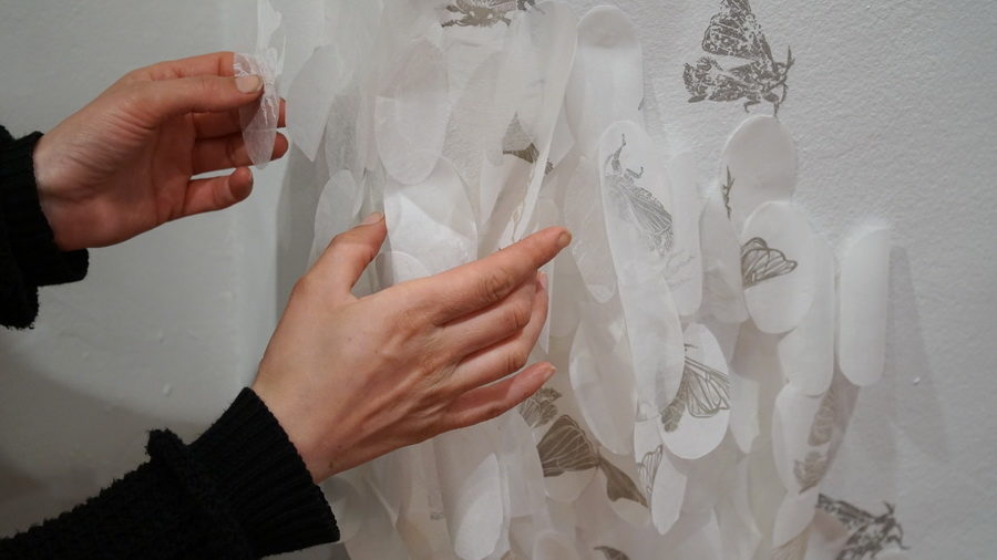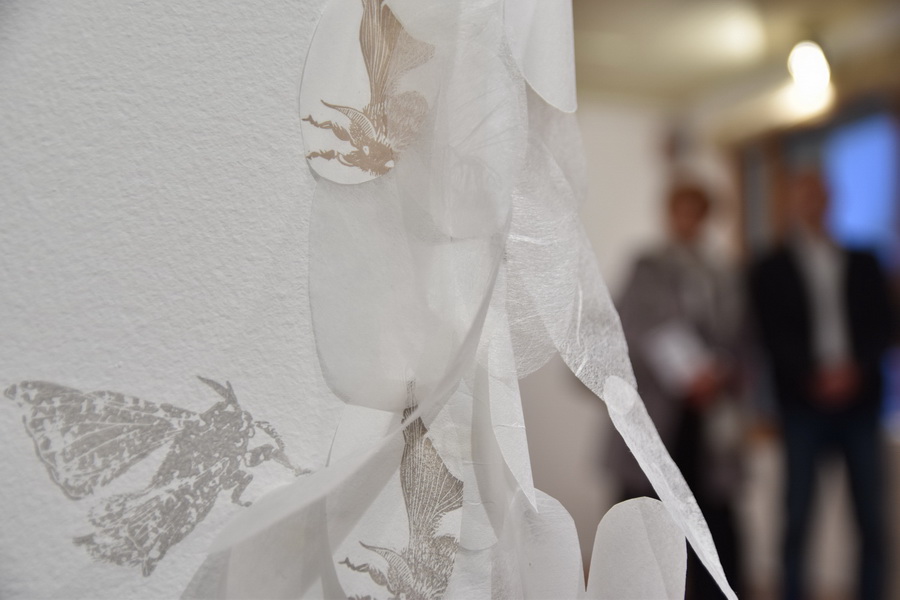 Čudnovati proces preobrazbe umjetnica nastavlja paralelnim razvojem motiva, pa tako na grozdove papirnatih kukuljica otiskuje motiv leptira koji kasnije prenosi i na zasebni zid. Leptir je simbol realizacije novorođene ideje, a ekvivalent mu u umjetničkom svijetu predstavlja završni otisak koji nastaje nakon otiskivanja matrice. Paralelno praćenje životnog i stvaralačkog ciklusa od jajašca, ličinke, kukuljice do leptira u kontekstu dudova svilca, odnosno začetka ideje, izrade matrice, procesa otiskivanja i završnog otiska u području likovnog stvaralaštva svjedoči o neminovnoj potrebi ne samo za osnovnom životnom egzistencijom već za neprikosnovenom potrebom umjetničkog stvaralaštva. Pritom izložbeni prostor galerije postaje psihološka biografija umjetničinog stvaralačkog procesa.