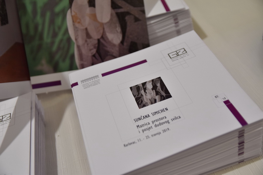Na izložbi “Matrica prostora i posjet dudovog svilca” umjetnica objedinjuje starije radove i radni materijal, te intervenira u gotove radove i oplemenjuje ih novim elementima transformirajući pritom izložbeni prostor u radni prostor. Svojevrsnim work in progress pristupom Sunčana Simichen kontinuirano nadograđuje novonastalu prostornu instalaciju za vrijeme trajanja izložbe. Posjetitelj tako može istovremeno vidjeti rad “Matrica prostora” sastavljen od ukupno 18 otisaka, ali i matrice linoreza bez kojih krajnji otisak ne bi bio izvediv. Rad je relevantan u kontekstu akcentuiranja i reminiscencije na vremenski period studiranja autorice u kojem je umjetnost bila na prvom mjestu. Otisak prikazuje kuhinju stana u kojem je Sunčana Simichen živjela dok je studirala, a koju pamti kao mjesto svakodnevnog boravka i inspiracije. Iz donjih uglova grafike prema središtu šire se mrljasti oblici kao znak autoričine prisutnosti u prostoru. Mrlje se postepeno stanjuju i formiraju u isprekidane linije koje usmjeravaju fokus promatrača na bazične kuhinjske elemente. Boravak u stanu u kojem je dio prostora bio obložen linoleumom nagnao je umjetnicu da percipira navedeni materijal kao radni materijal od kojeg je u konačnici izradila matrice linoreza. Inspiracija životnim prostorom te upotreba predmeta i materijala iz svakodnevne okoline prirodno su rezultirali izradom djela “Matrica prostora” u kojem je autorica prostor kao nešto apstraktno otisnula, materijalizirala i dokumentirala u svom radu.