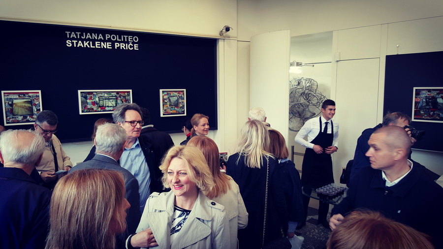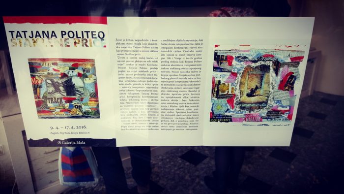 “Živim u sasvim maloj kućici, ali njezini prozori gledaju na vrlo veliki svijet” izrekao je mudri Konfucije. Prozori Tatjane Politeo pružaju pogled na svijet staklenih priča – jedan prozor predstavlja jedan fragment života. Kroz pet tematskih cjelina – arhitektura i dizajn, ljudi i situacije, moda, priroda, te kukci i ptice – autorica interpretira neposredne crtice iz života. Prepoznatljivim vizualnim rukopisom Tatjana Politeo gradi kompoziciju kombiniranjem kolaža, slikarskog morta i akrilne boje. Predstavljeni radovi objedinjeni su osobnim pečatom umjetnice – crvenom linijom koja teče gornjim rubom radova, a koja povremeno biva ujednačena crnom linijom u podnožju. Boja krvi i vatre uravnotežena je distanciranom crnom – bojom smrti, samoće i misterije. Poput yina i yanga ove dvije snažne boje harmoniziraju mnoštvo zbivanja u središnjem dijelu kompozicije, dok bočne strane ostaju otvorene, čime je omogućen kontinuirani razvoj niza tematskih cjelina.
