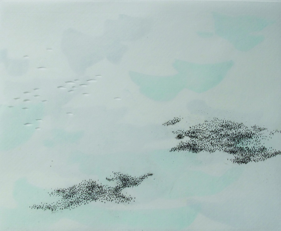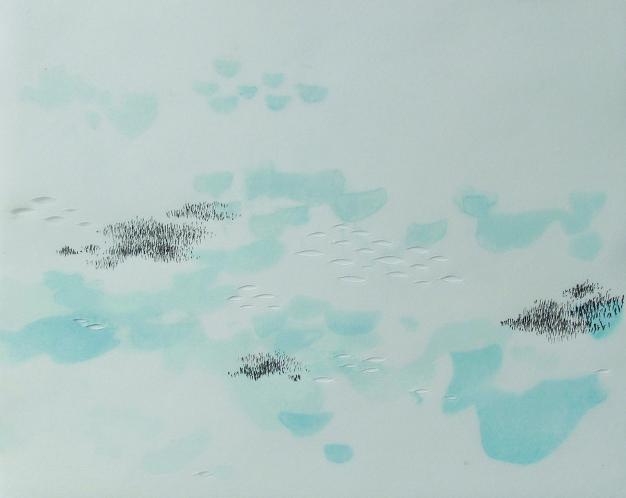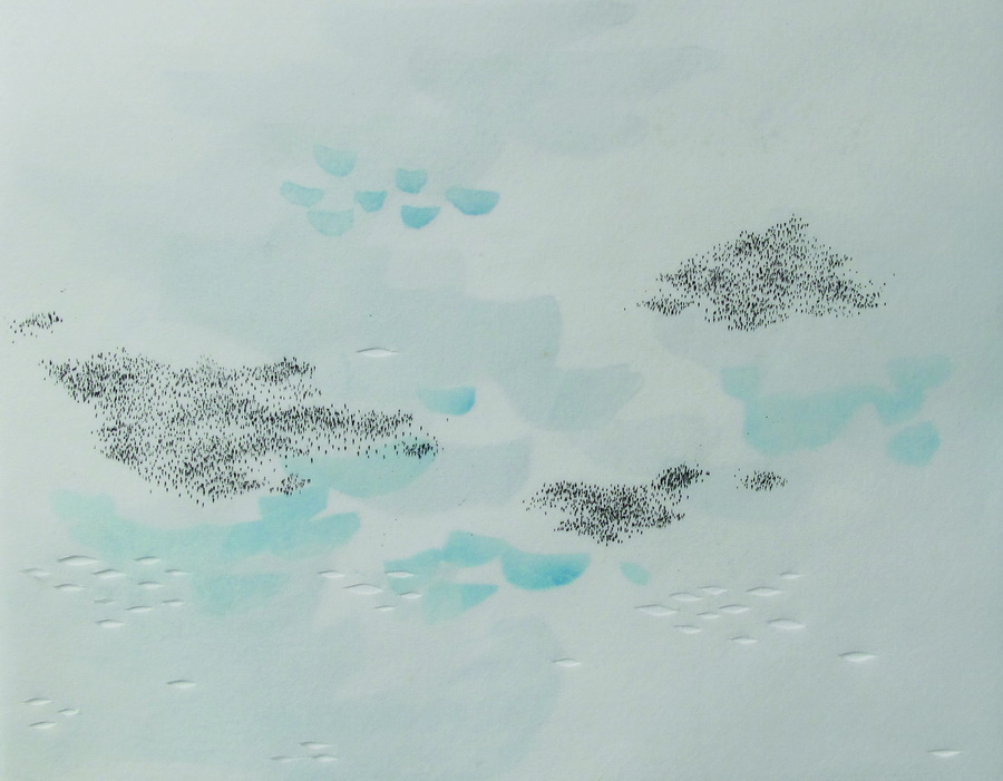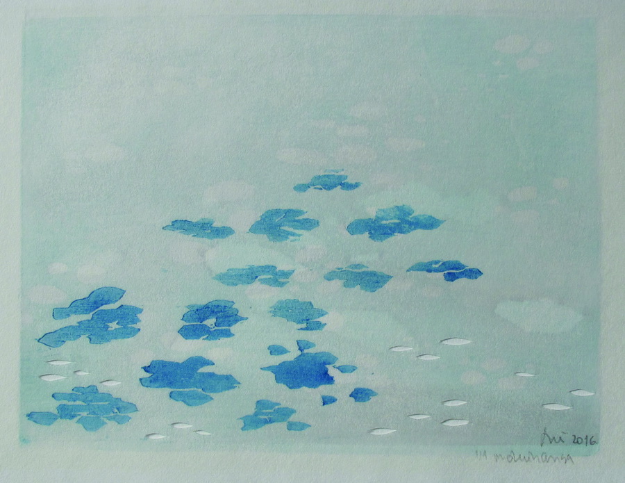No, kako uistinu vizualizirati misao ili emociju, nešto toliko apstraktno, a istovremeno krajnje relevantno za svaki trenutak našeg života? Polazeći od crteža koji se ponekad razvija u mediju grafike ili umjetničke knjige Tihana Karlović svoje istraživanje bazira na odrazu prirode koja izravno korespondira s njezinim osobnim iskustvom. Sve ono nematerijalno, duhovno i inspirativno u ljudskom biću autorica bilježi kroz transparentno, fluidno, eterično, transformirajuće i kontemplativno u prirodi. Promjenjiva, nejasna i poprilično neodređena priroda oblaka simbol je preobrazbe viđene ne samo u jednom od njegovih izraza, već u samom postojanju.[1] Oblaci kao nositelji kiše s očitovanjem nebeske djelatnosti povezuju se s plodnošću i simbolikom vode, dok ružičasti oblaci u pojedinim civilizacijama simboliziraju sreću i veselje.[2] Kroz maglu i izmaglicu kao simbole neodređenosti ili stanja koje dolazi prije otkrivenja postepeno zalazimo u područje svjetlosti kao simbola života, slobode i sreće. I dok je voda izraz zemaljskih sila, svjetlost poimamo kao izraz nebeskih sila.[3] Zrake svjetlosti rađaju prostranost i otvaraju bogatstvo duhovnog sadržaja. Bilježeći duhovno u likovnome Tihana Karlović oblikuje akromatske crteže tušem i perom. Krajnje pročišćene, minimalističke kompozicije počivaju na dijalogu između koncentriranih linijskih ili perforiranih skupina oblika i velikih površina zrakopraznog prostora definiranog bjelinom odnosno čistinom neprozirnog papira. Kontrast gustoće crnih linija i perforiranih oblika što lebde unutar kompozicije stvara polje nevjerojatnog mira i tišine. U mediju grafike umjetnica koristi tehniku japanskog drvoreza koji je poznat po svojoj iznimnoj umjetničkoj izražajnosti, kolorističkim kombinacijama i specifičnom ručnom tiskovnom procesu. Kao i crteže, Tihana Karlović svoje grafike perforira, reže i otiskuje koristeći više različitih matrica, boja i papira različite gustoće što joj omogućuje istraživanje i praćenje promjena koje se odvijaju unutar planova, perforacija, igre sjena i svjetla koje prodiru kroz transparentan papir i otvore, te tako utječu na cjelokupan doživljaj djela.