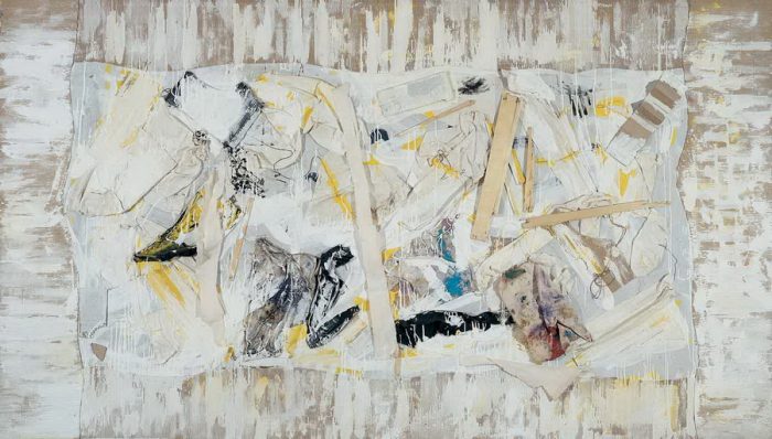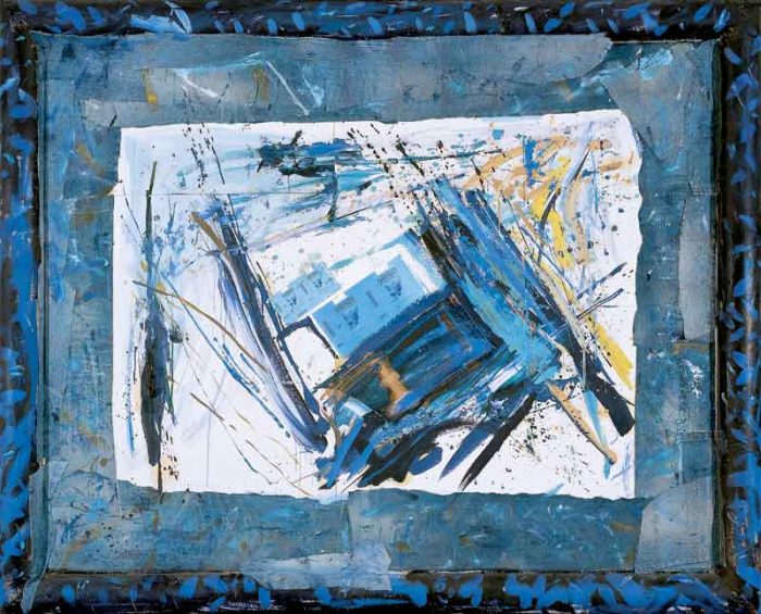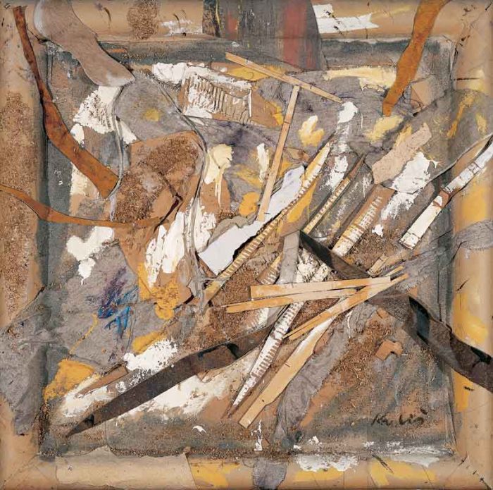 Posve drugačiji likovni izričaj karakterizira cikluse Slike-kolaži i Objekti-kolaži nastale početkom 90tih godina. Uvođenje reljefnosti, primjena materijala kao što su konci, kartoni, letvice, voda, čavli, pijesak, te prigušenost dominantnog oker tonaliteta u kombinaciji s bijelom bojom karakteristike su djela nastalih za vrijeme Domovinskog rata kada umjetnik vođen emocijama stišava svoj slikarski jezik i daje vlastiti komentar tadašnjeg vremena uporno nastavljajući likovno djelovati, ali sa skromnijim i prigušenim kreativnim izrazom u skladu s potrebama i mogućnostima cijelog naroda.