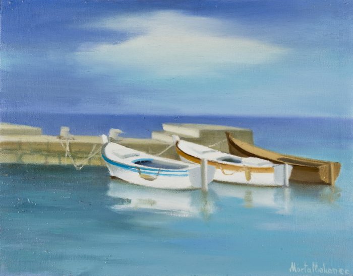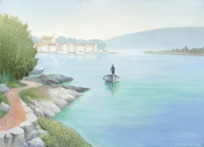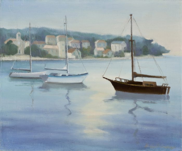 Ako, primjerice, promotrimo sliku Barke gdje bjelinu brodica dodatno ističe zloslutno nebo i uljana površina mora zrcaleći olujni ton, primjećujemo da unatoč mrkom nebu prikaz djeluje gotovo nestvarno idilično. Sličan dojam ostavlja i djelo Jedrenjaci, ulje na platnu čiji refleksivni akcenti stvaraju dojam zaleđene vodene površine na kojoj lebde jedrenjaci dok kamene kuće u pozadini čine kulisu ove lirske kompozicije.