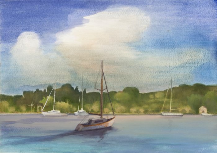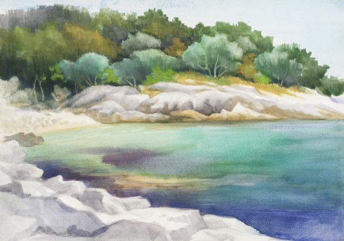 Bilježeći skrovite puste uvale okružene stjenovitom obalom i mediteranskim biljem, autorica se fokusira na stvaranje morskih dubina i bogatstva zelenila okolne prirode koristeći široku paletu plavih i zelenih tonova. Intimnost smirujućih krajolika arkadijskog značaja proizlazi iz svjesnog odabira kadra iz prikrajka, udaljenog od vreve zbivanja, gdje centar grada biva smješten u pozadinu prikazanog motiva. Prizori lišeni ljudske prisutnosti, osim pojedinih figura tek naznačenih u daljini, omogućuju promatraču upijanje ljepote prirode.