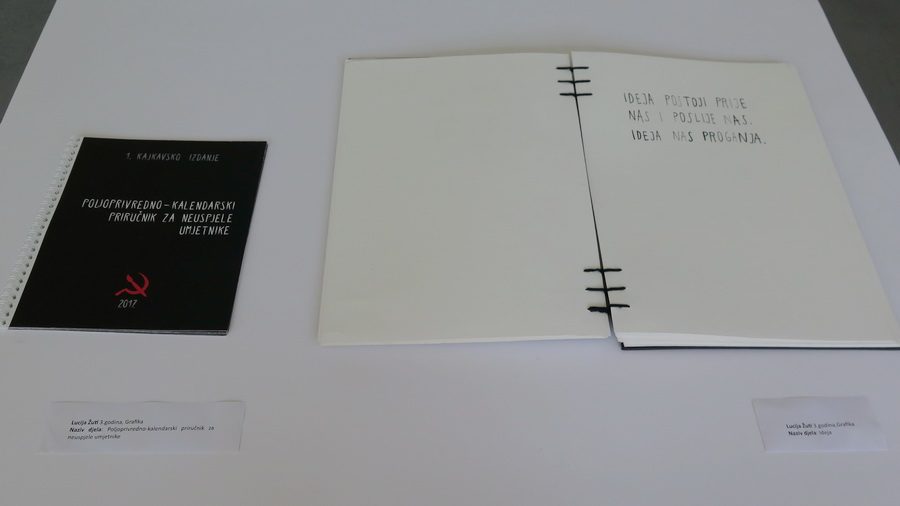 Završna izložba studenata Odsjeka za likovnu umjetnost otvorena je u petak 9. lipnja 2017. u 18 sati u Zgradi kiparstva, Cara Hadrijana 10/A, gdje su bili predstavljeni kiparski radovi. U 19 sati je za posjet bila otvorena i Likovna zgrada, Cara Hadrijana 8/B, s radovima iz slikarstva, kiparstva, grafike i multimedije.