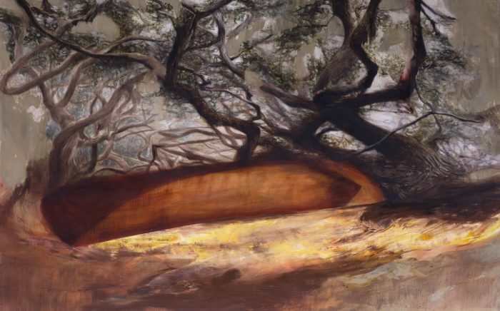 Niz donekle funkcionalnih objekata prekida prikaz prevrnute kuće. Svježe obojana drvena koliba posve je nefunkcionalna. Zastrašujući pogled u akromatski oblikovanu unutrašnjost pogled je u prošlost i zaboravljenost. Umrtvljena priroda tamnih tonova odaje dojam zgarišta, što dodatno naglašava kompoziciju izmještenog i neupotrebljivog ljudskog objekta. Posljednja nastamba svojim oblikom više podsjeća na čamac, dok isprepletena razgranata stabla stvaraju veliko težište i opterećenje nad jednostavnom površinom naopako položenog čamca u svrhu formiranja skloništa.